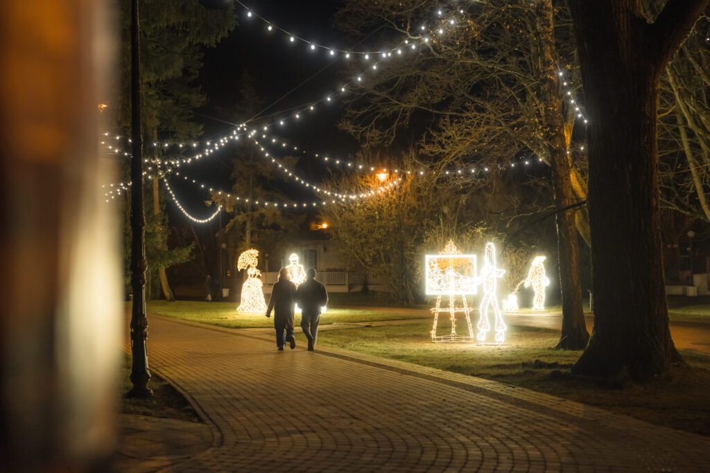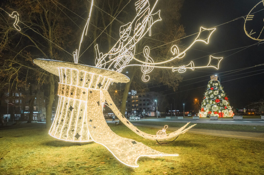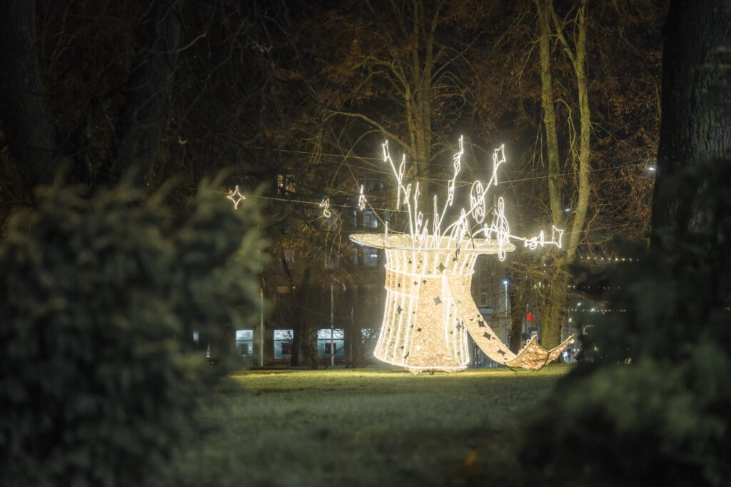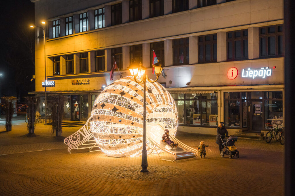 Līdz ar pilsētas lielās egles atklāšanu Rožu laukumā Liepājā tiek iedegti svētku rotājumi, kas mirdz viscaur pilsētai un aicina gan liepājniekus, gan arī tuvus un tālus pilsētas viesus doties pastaigā pa pilsētu. Pietam šogad rotājumu klāstu papildina jauni mākslinieciski tēli jaunās vietā – īpaši sapņaina noskaņa sagaida Jūrmalas parkā un pie Gulbju dīķa.