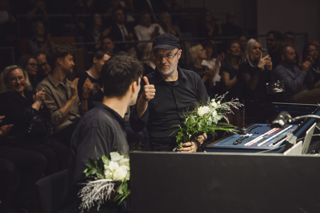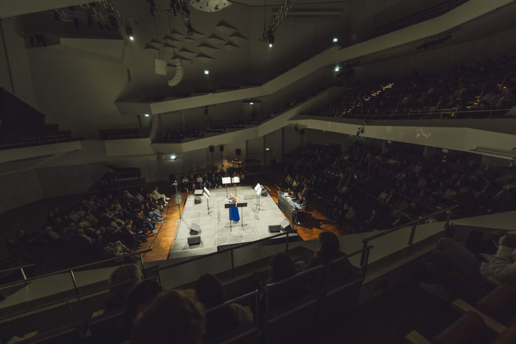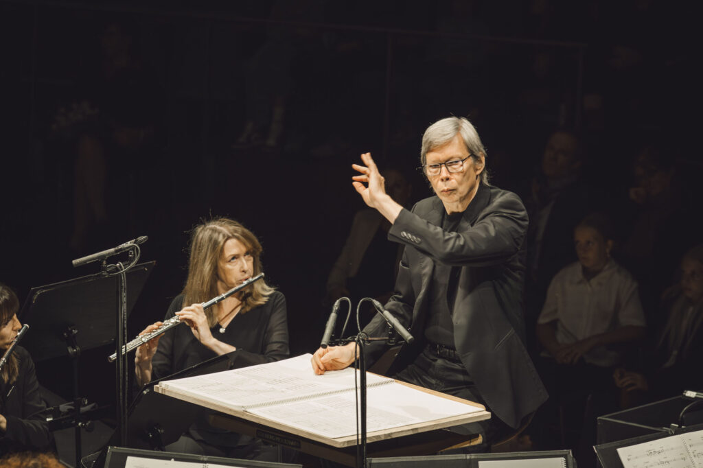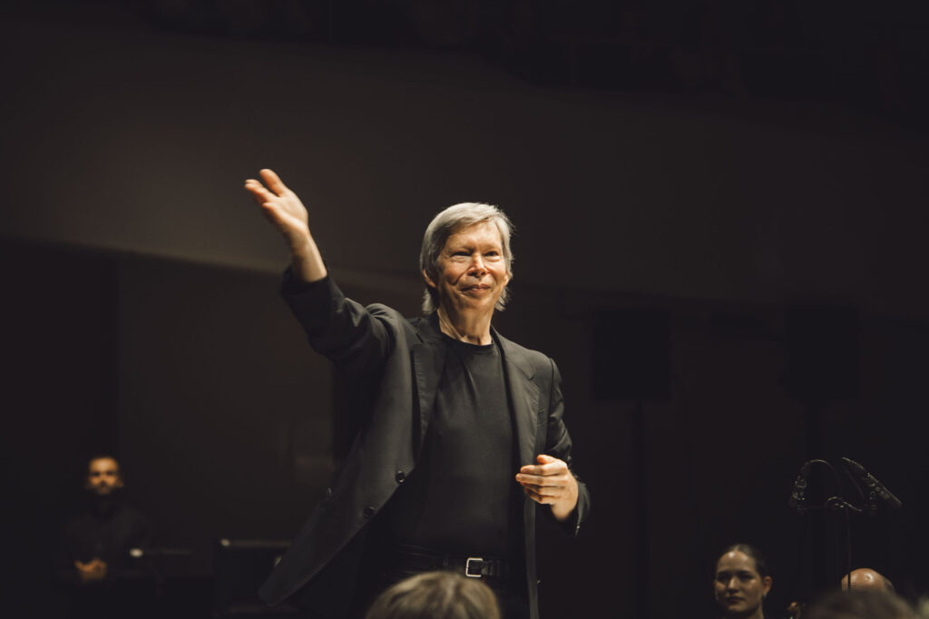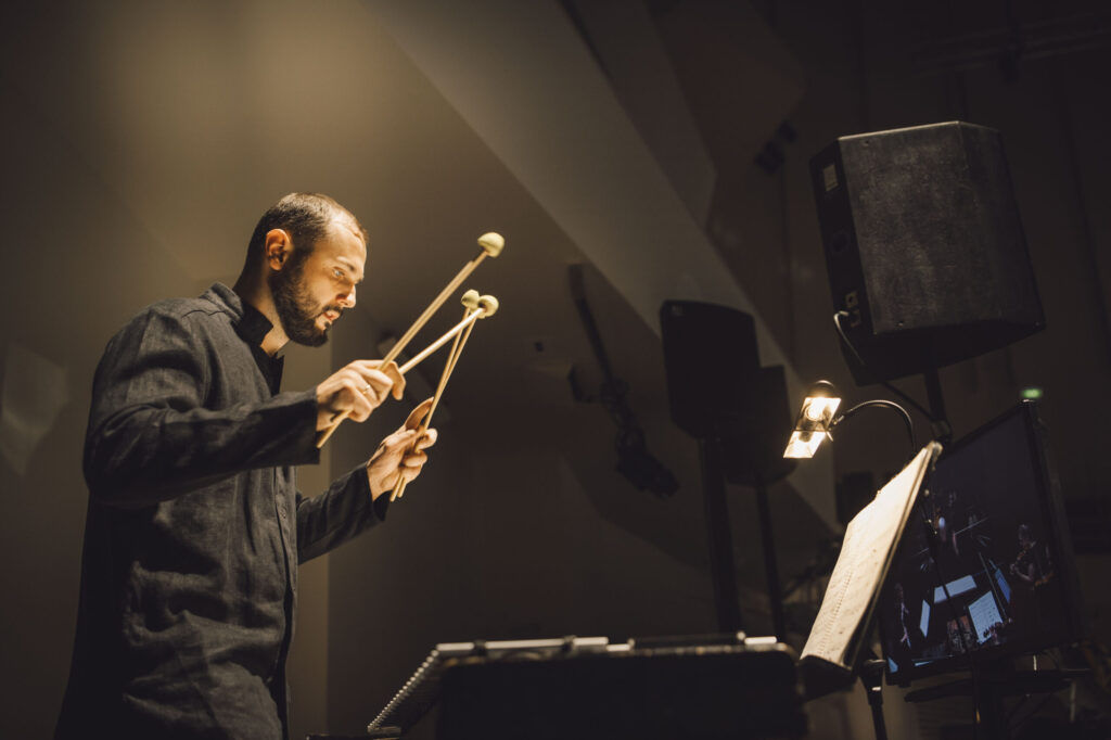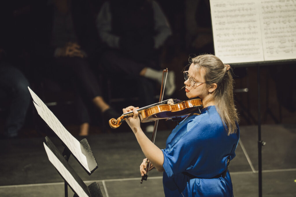 Koncerta pirmajā daļā starptautiski atzītā latviešu vijolniece Magdalēna Geka atskaņoja Bulēza skaņdarbu vijolei “Anthèmes II” (1997), kurā notiek nemitīga transformācija un jutīgs dialogs starp cilvēku un tehnoloģiju. Vijole savijas ar dzīvo elektroniku, kas reāllaikā transformē un atspoguļo instrumenta skaņu telpiski daudzdimensionālā ainavā.
