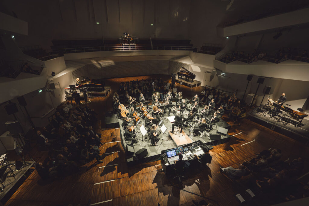 Programmas kulminācijā, uz skatuves vienojoties kamerorķestrim “Sinfonietta Rīga” diriģenta Normunda Šnē vadībā, starptautiskam solistu ansamblim un IRCAM speciālistiem, izskanēja viens no Bulēza iespaidīgākajiem un skaistākajiem skaņdarbiem “Répons” (1980–1984).