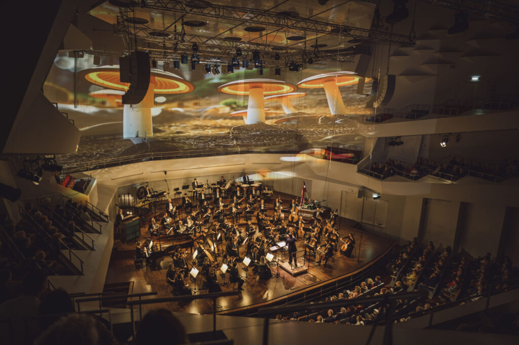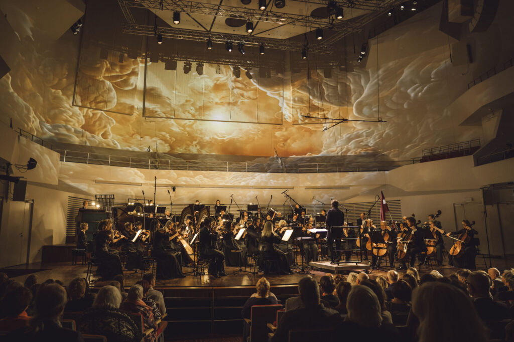 Koncerta otrajā daļā lielo zāli izgaismoja iespaidīgas videomākslinieka “-8” radītas videoprojekcijas, kuras veidotas īpaši šim koncertam ar mērķi radīt klausītājam sajūtu it kā viņš pats atrastos kustībā, dejā. “Brīžiem ļaujoties galvu reibinošām piruetēm, citkārt slīdot lēnā valsī, skatītājs izdejo ceļu cauri dažādām Latvijai raksturīgām ainavām, kas izsapņotas ar jaunāko tehnoloģiju palīdzību,” vizualizācijas raksturo mākslinieks.