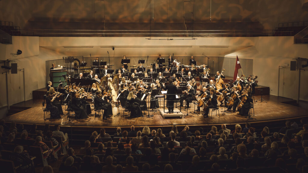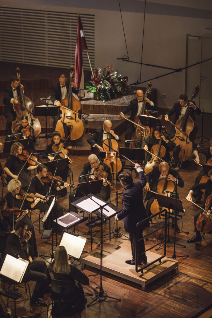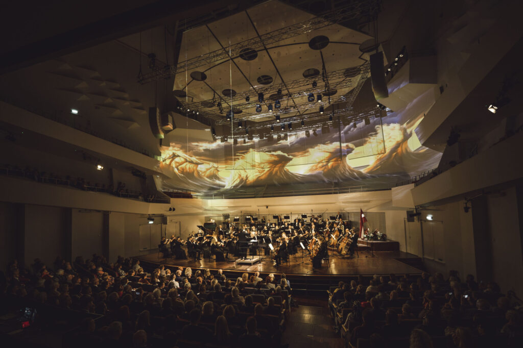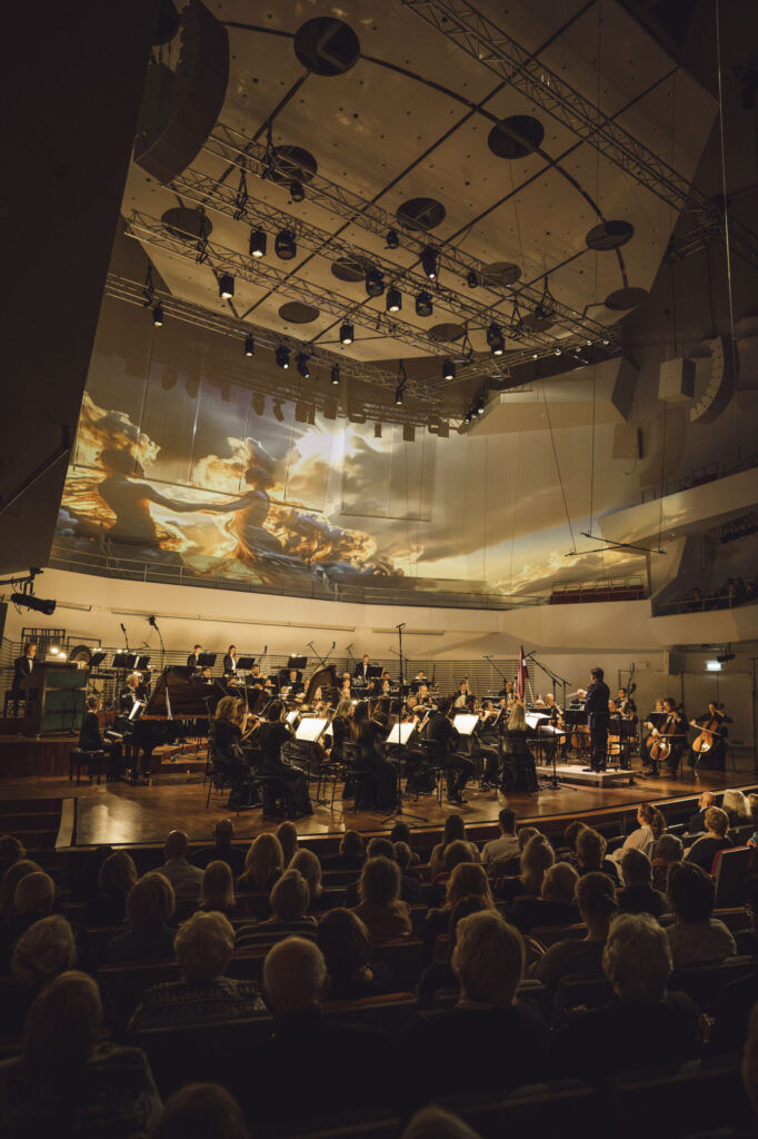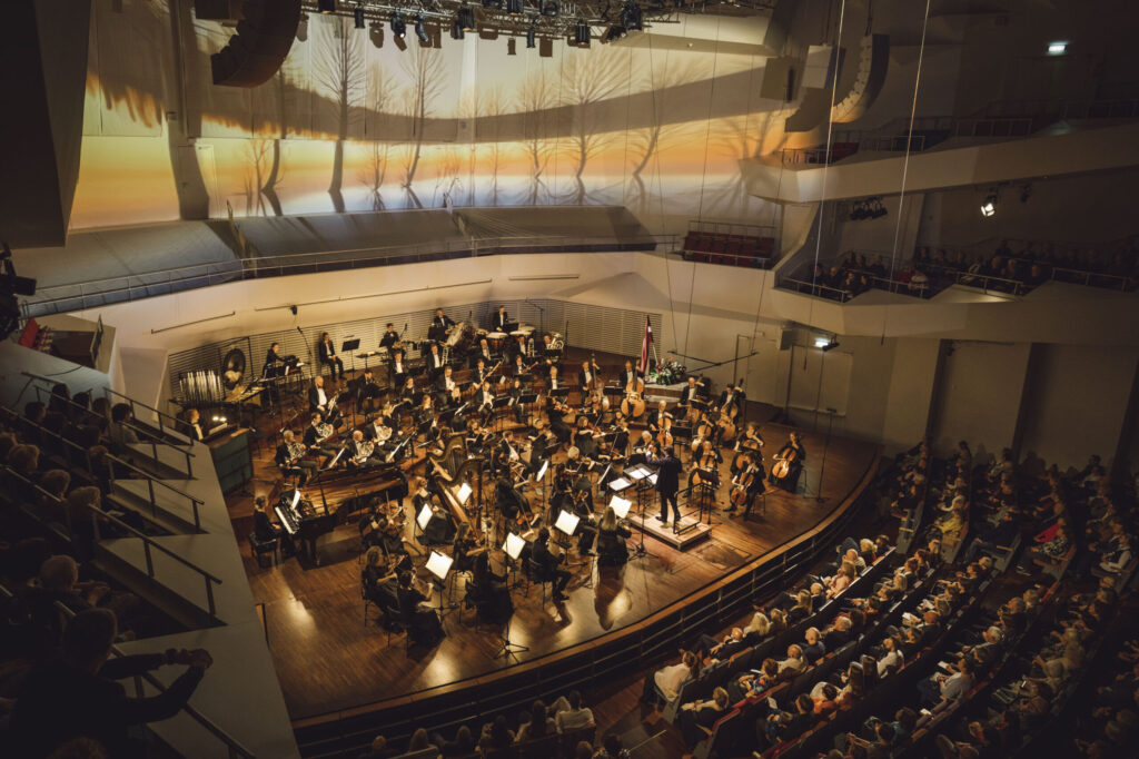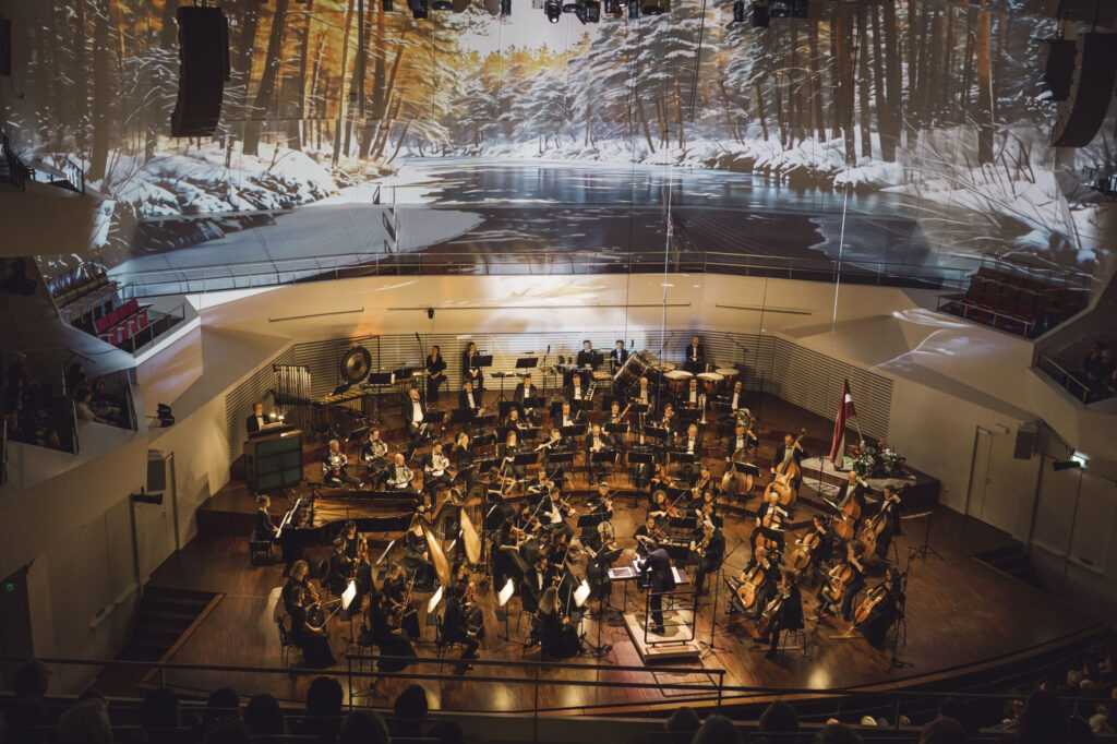 Vakara noslēgumā klausītājiem klātienē un tiešraidē “Digitālajā dzintarā” visā pasaulē bija iespēja baudīt svētku koncertu, kur tika celtas godā latviešu komponistu simfoniskās dejas. Programmu atklāja skatuves dejas klasika – Jurjānu Andreja četrdaļu cikls, kur goda vietā ir slavenās pāru dejas “Jandāls” un “Ačkups”. Ar savu raksturīgo humoru skanēja Pētera Plakida “Dziedošā prelūdija un dancojošā fūga”, noslēgumā uzplaiksnījot “Tūdaliņ, tagadiņ” motīvam. Daudzkrāsainas ainas iz Mērdzenes gadatirgus Latgalē izgaismojās Edmunda Goldšteina spilgtajos “Mērdzenes dančos”, kam sekoja Jāņa Ķepīša versija “Latvju dejām”, kuru vainago teju ikvienam zināmā meldija “Es mācēju danci vest”. Mūziku caurvija koncertzāles mākslinieciskā vadītāja Oresta Silabrieža rakstītas etīdes par deju Latvijas un latviešu likteņos.