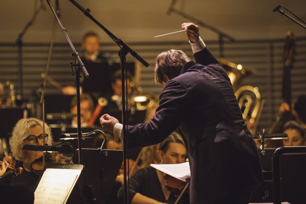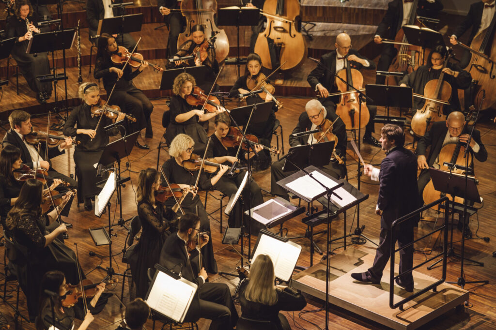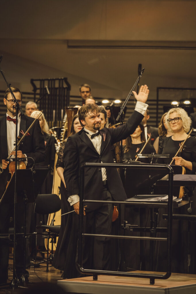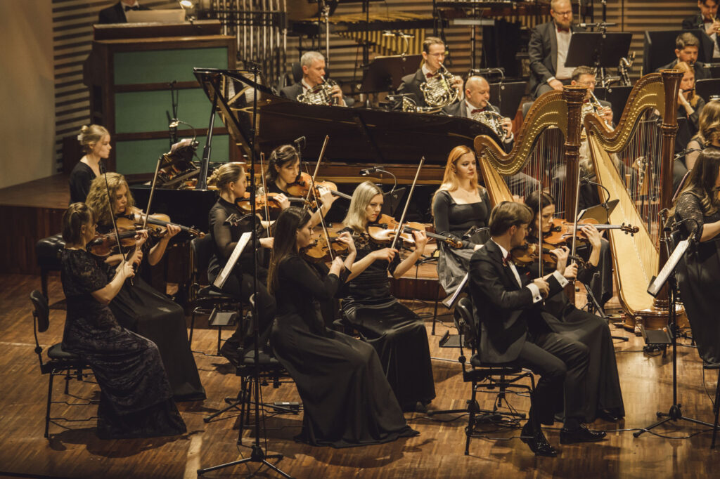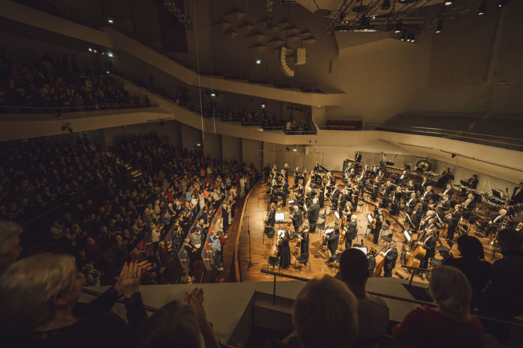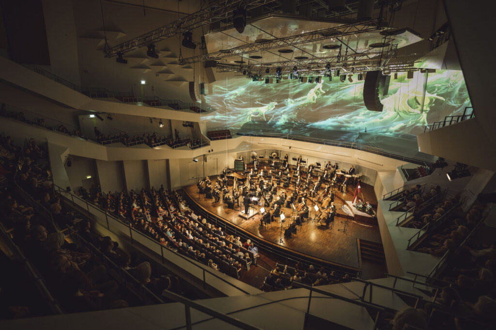 Vakara noslēgumā klausītājiem klātienē un tiešraidē “Digitālajā dzintarā” visā pasaulē bija iespēja baudīt svētku koncertu, kur tika celtas godā latviešu komponistu simfoniskās dejas. Programmu atklāja skatuves dejas klasika – Jurjānu Andreja četrdaļu cikls, kur goda vietā ir slavenās pāru dejas “Jandāls” un “Ačkups”. Ar savu raksturīgo humoru skanēja Pētera Plakida “Dziedošā prelūdija un dancojošā fūga”, noslēgumā uzplaiksnījot “Tūdaliņ, tagadiņ” motīvam. Daudzkrāsainas ainas iz Mērdzenes gadatirgus Latgalē izgaismojās Edmunda Goldšteina spilgtajos “Mērdzenes dančos”, kam sekoja Jāņa Ķepīša versija “Latvju dejām”, kuru vainago teju ikvienam zināmā meldija “Es mācēju danci vest”. Mūziku caurvija koncertzāles mākslinieciskā vadītāja Oresta Silabrieža rakstītas etīdes par deju Latvijas un latviešu likteņos.