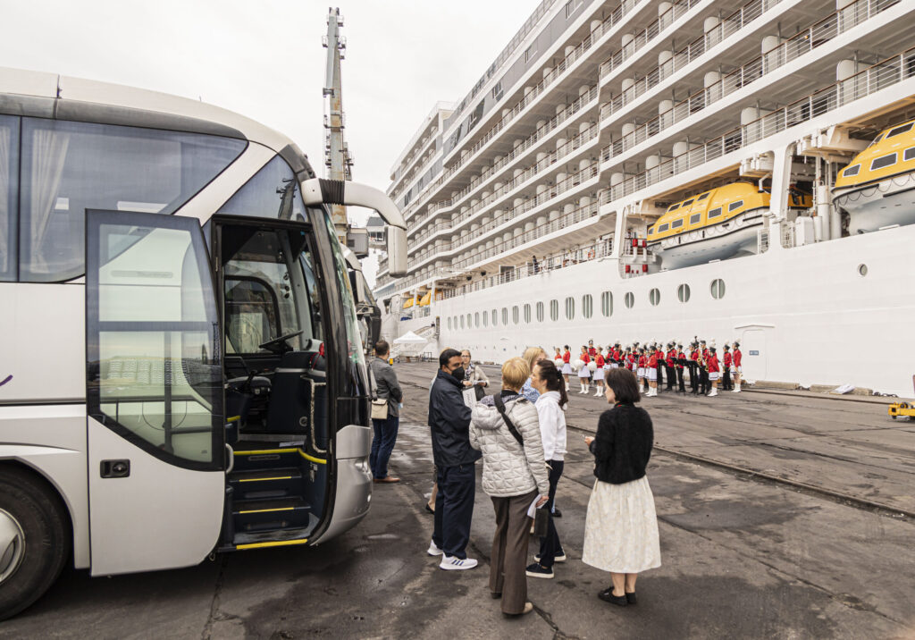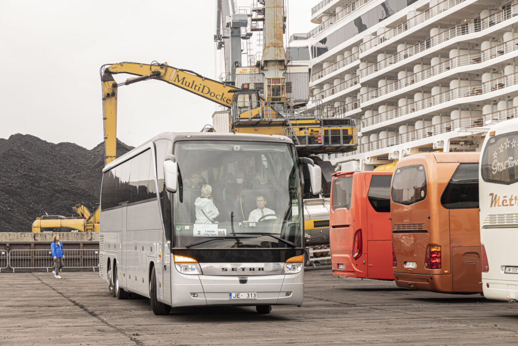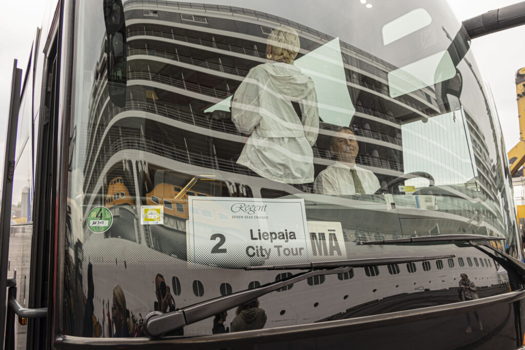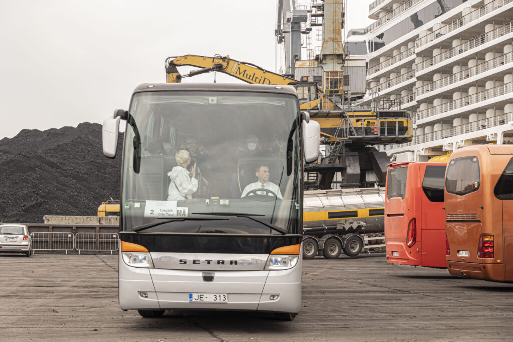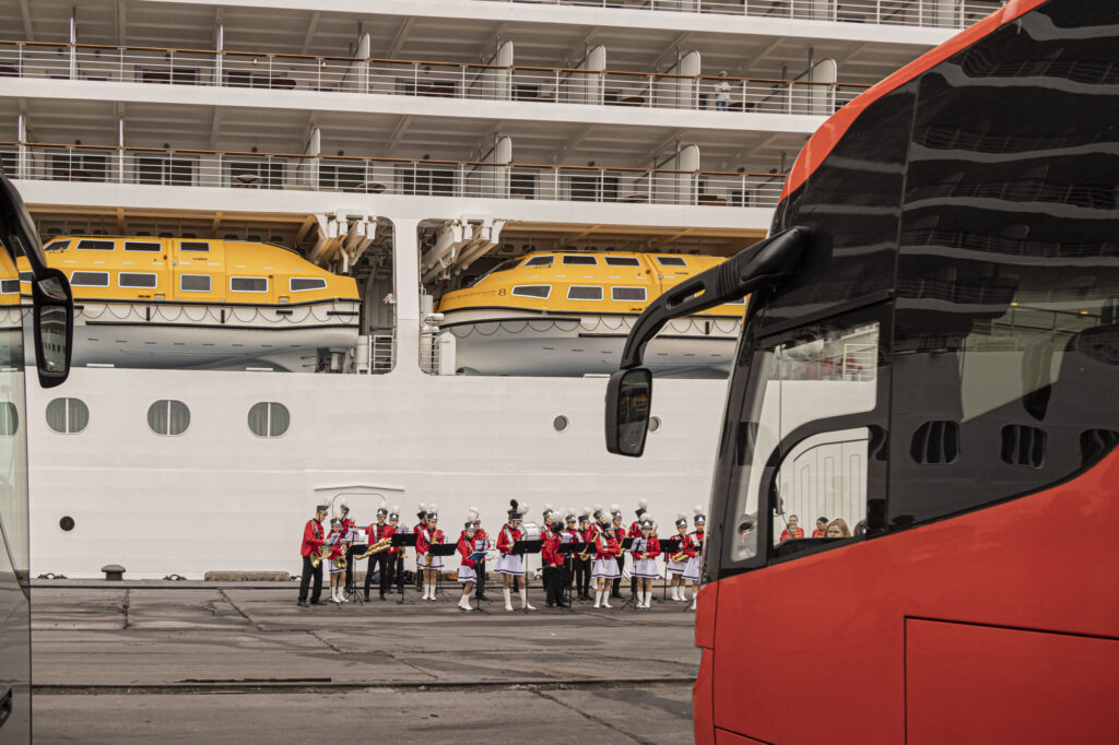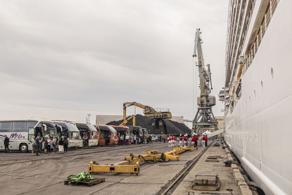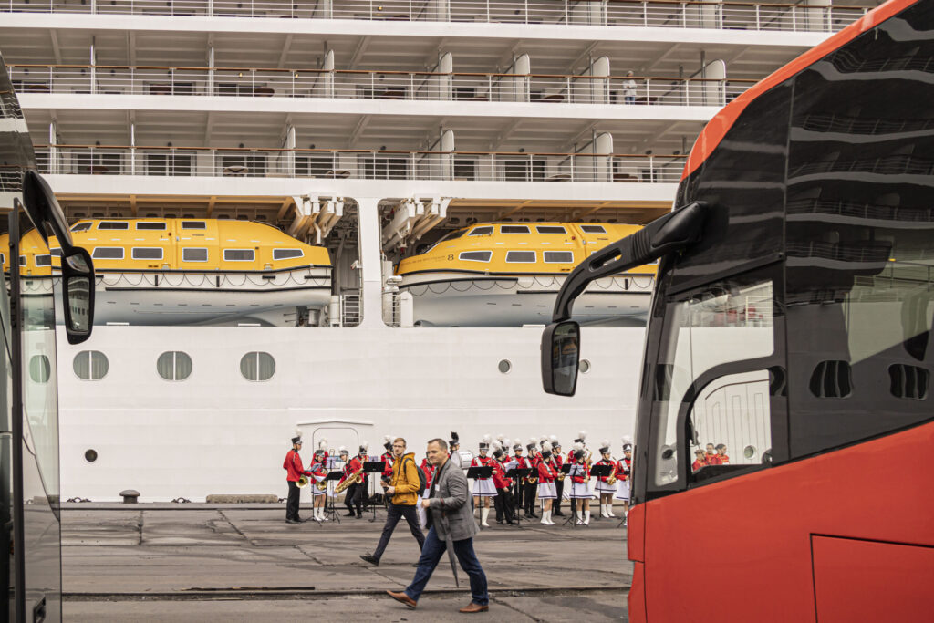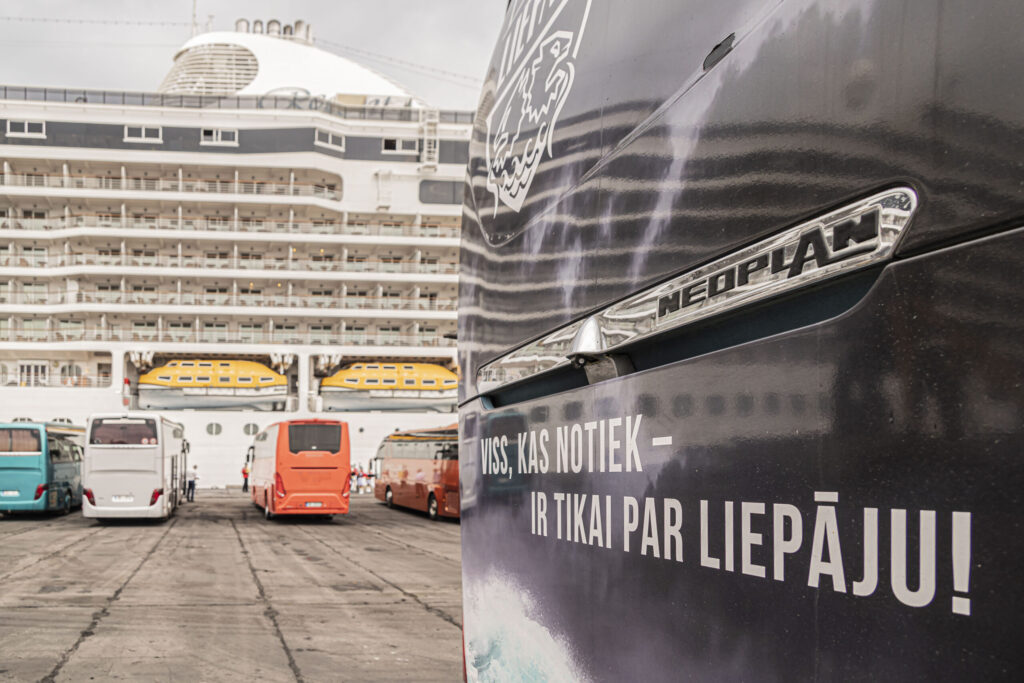 Kruīza kuģis tika sagaidīts ar pūtēju orķestri “Liepāja” un septiņiem autobusiem.