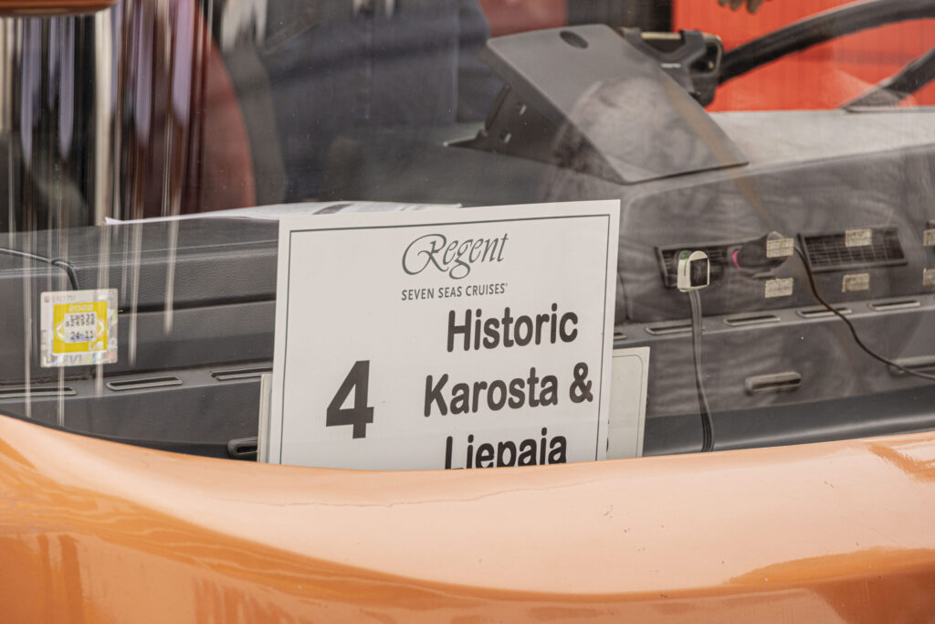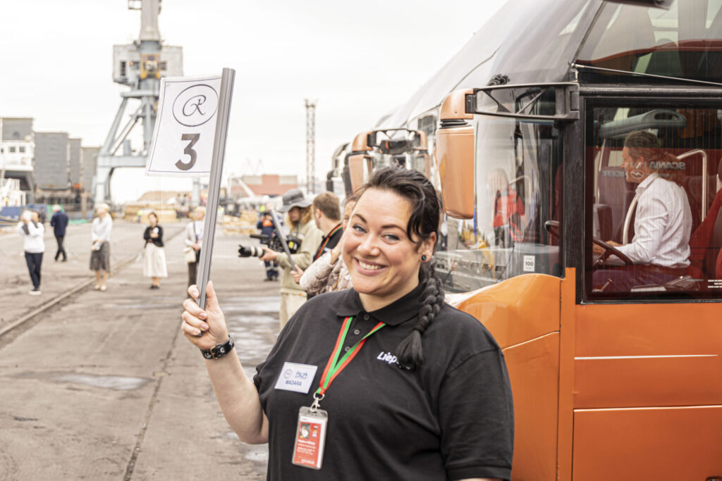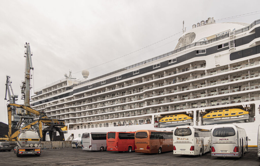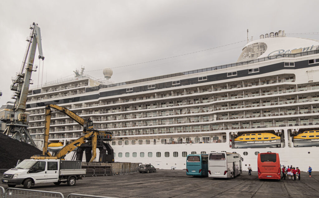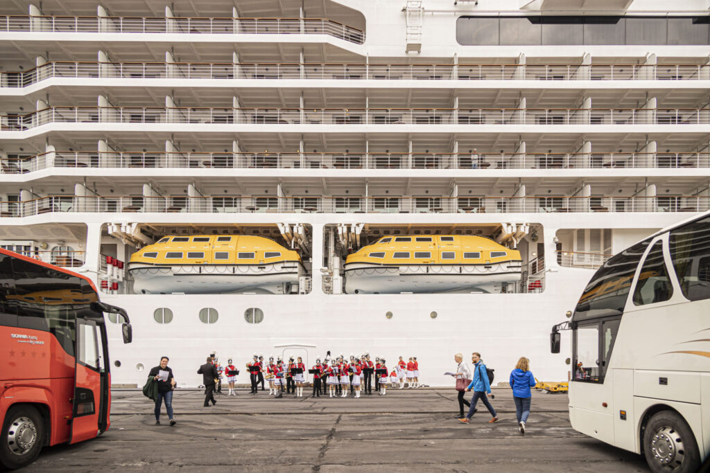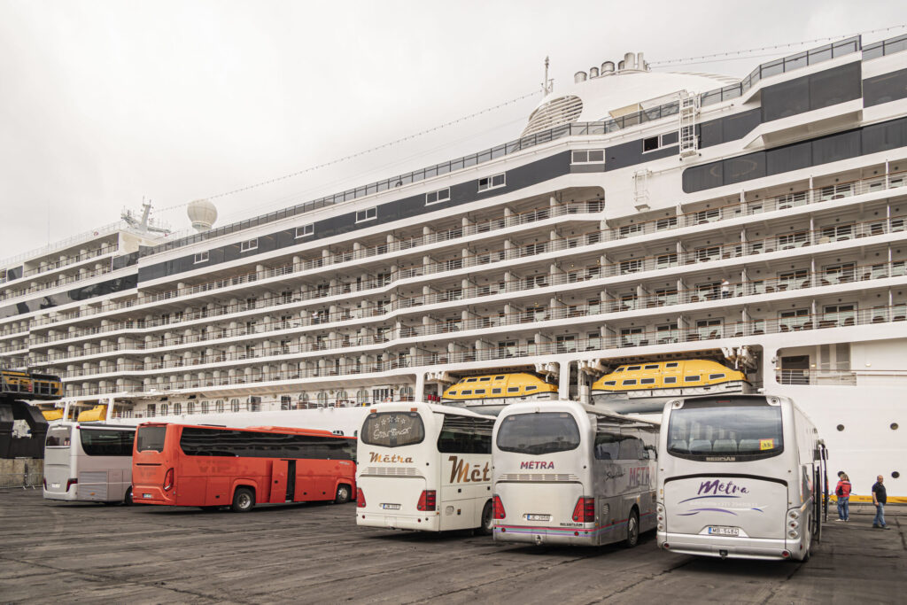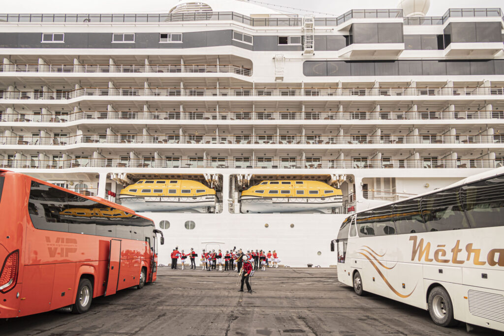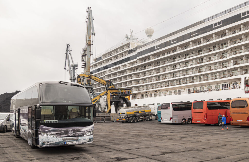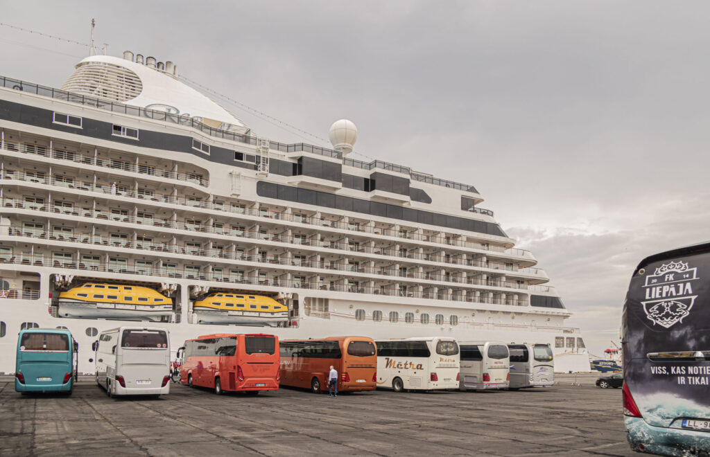 Kruīza kuģis tika sagaidīts ar pūtēju orķestri “Liepāja” un septiņiem autobusiem.