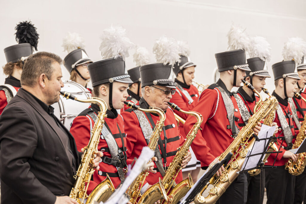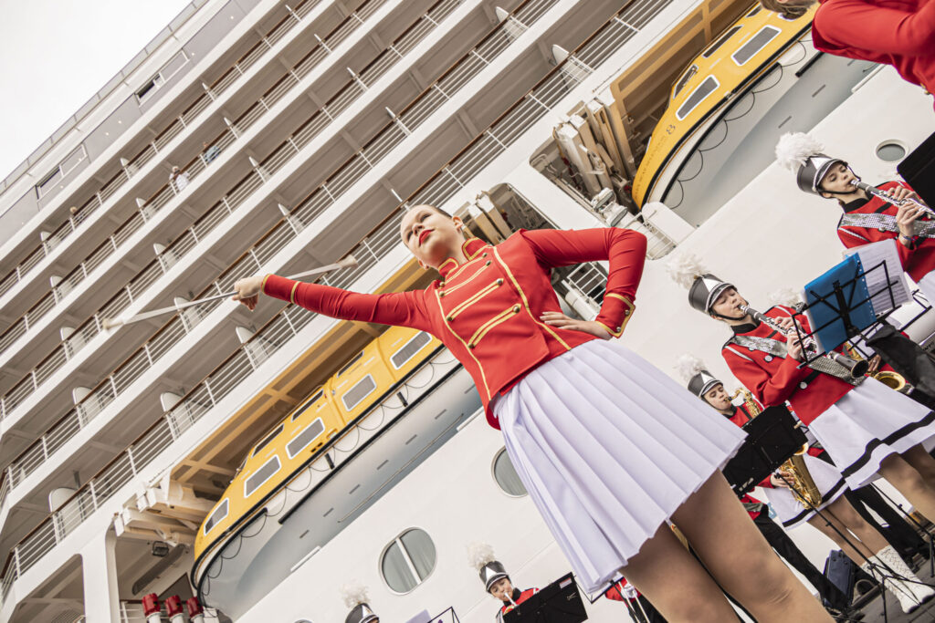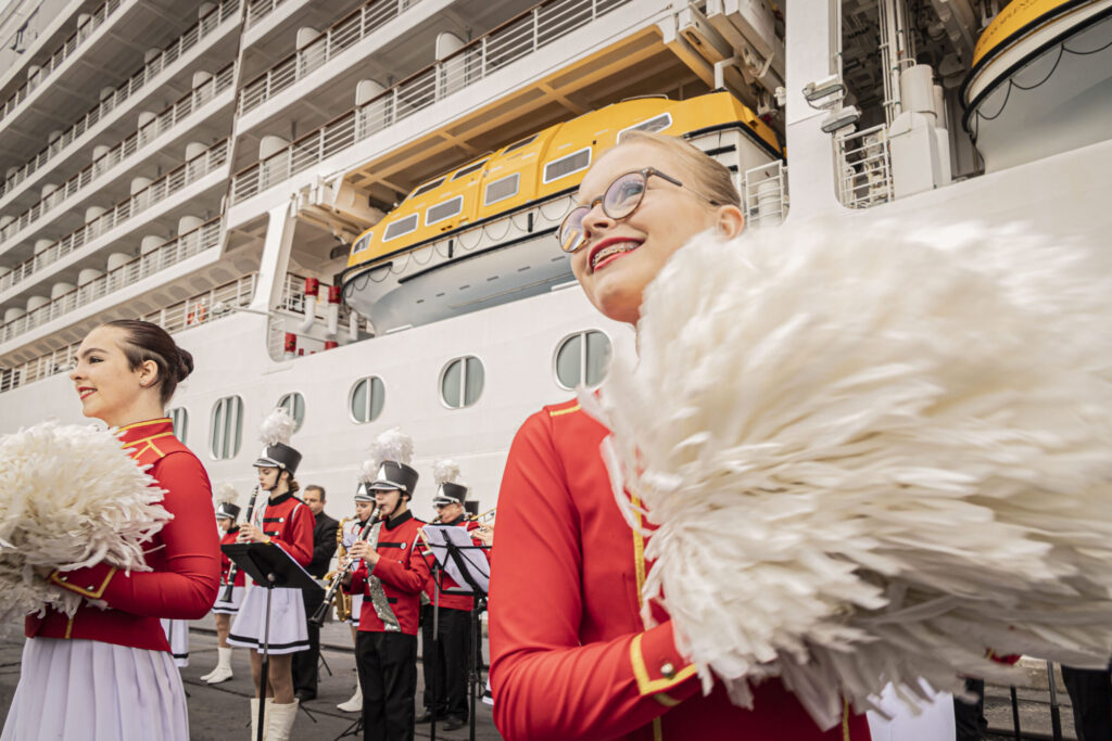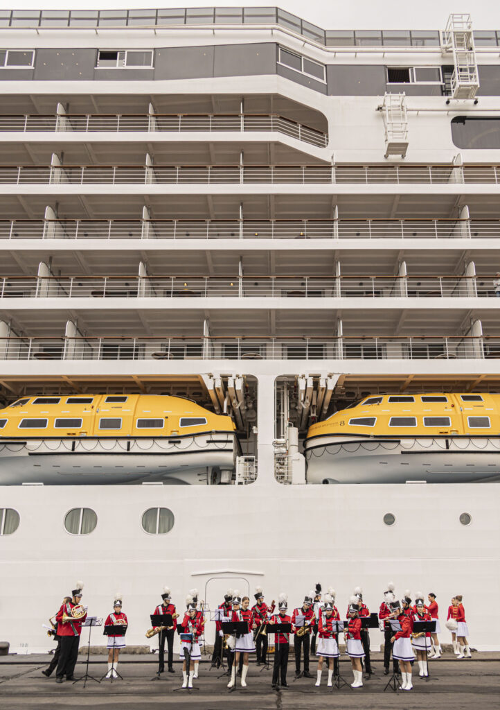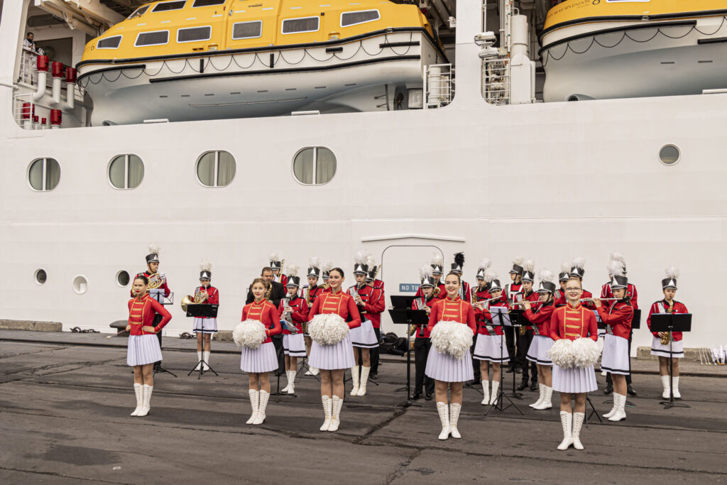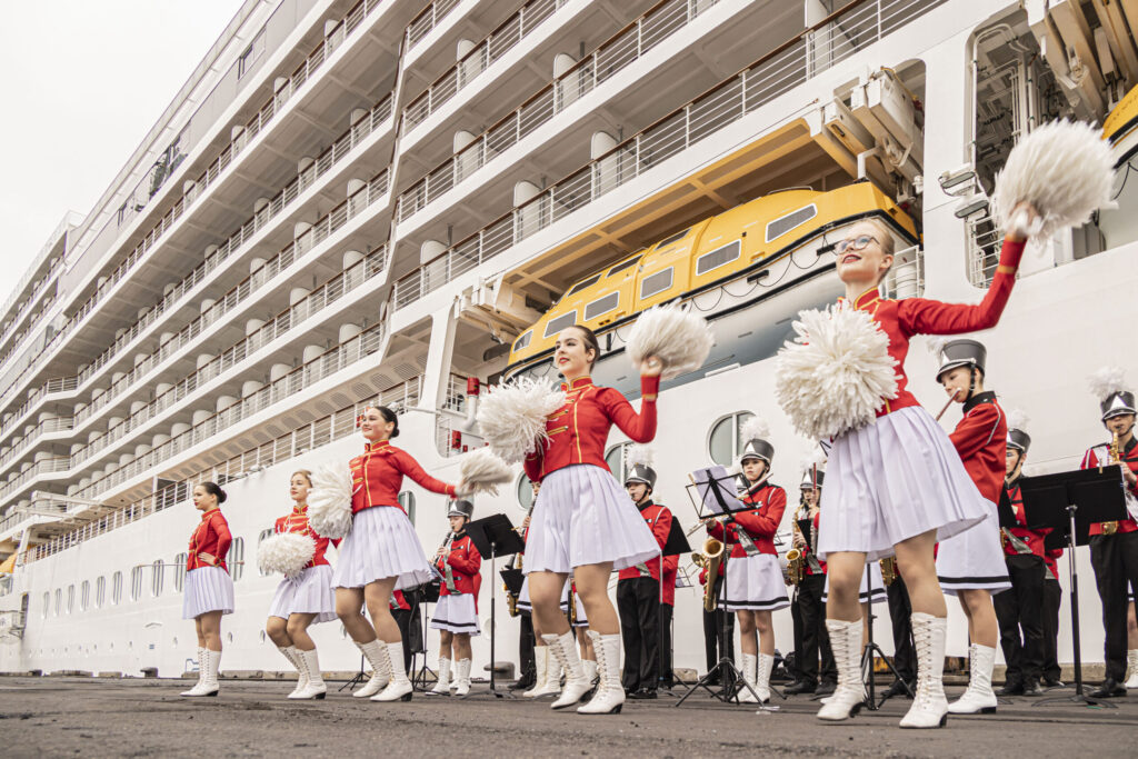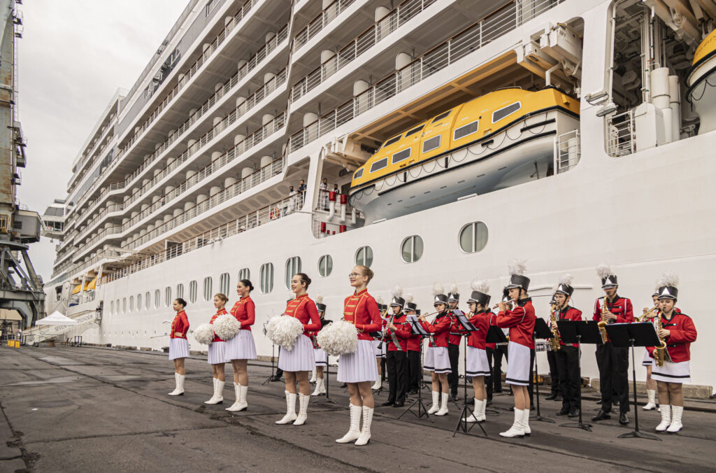 FOTO: Liepājā ar orķestri sagaida lielāko kruīza kuģi, kāds jebkad ir apmeklējis vēju pilsētu