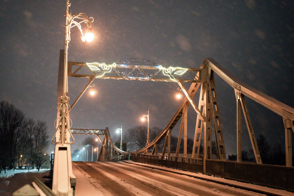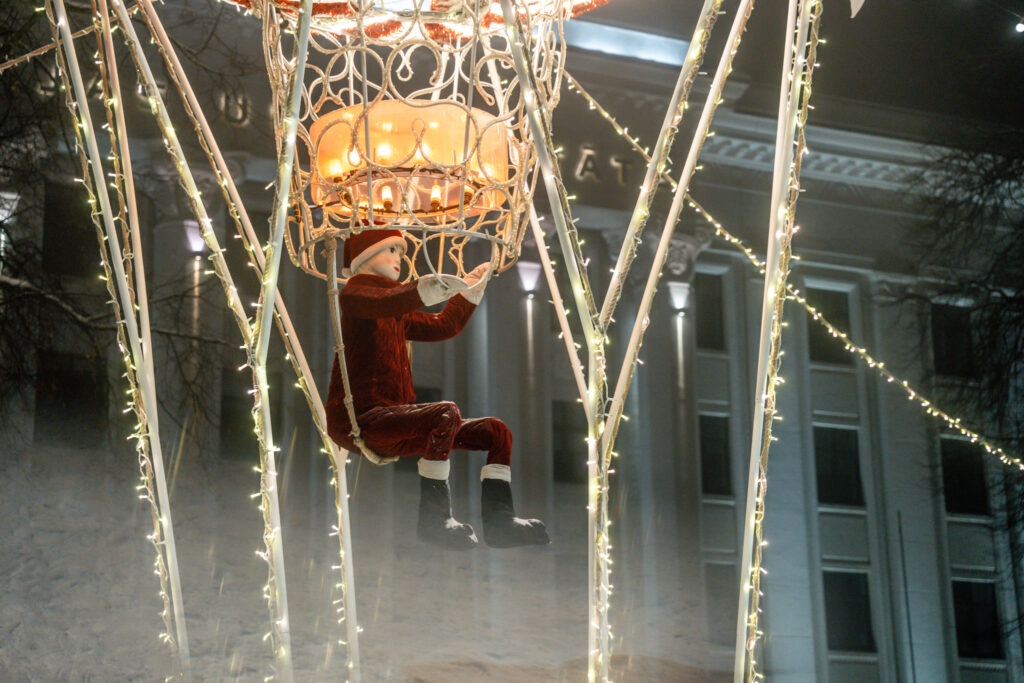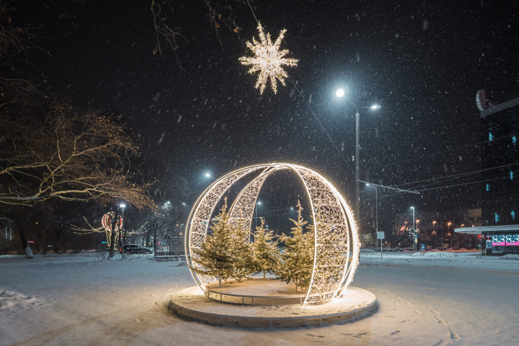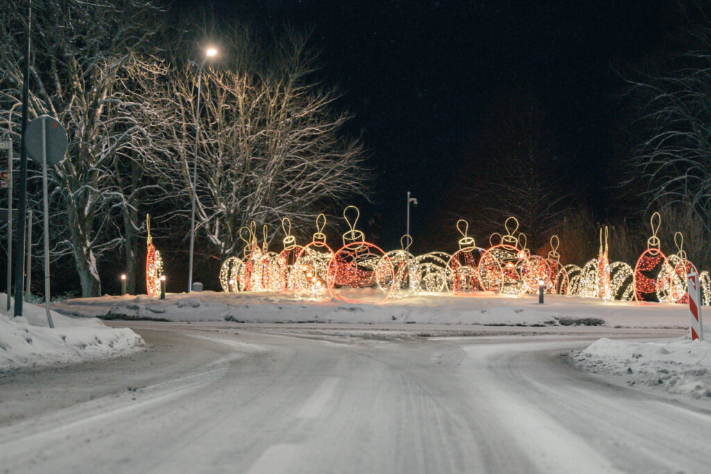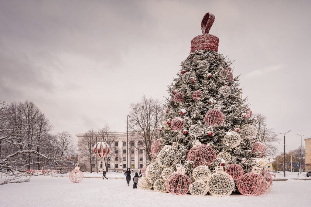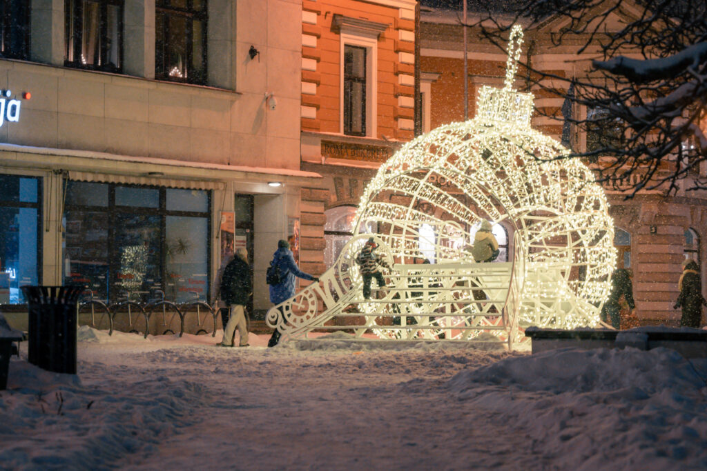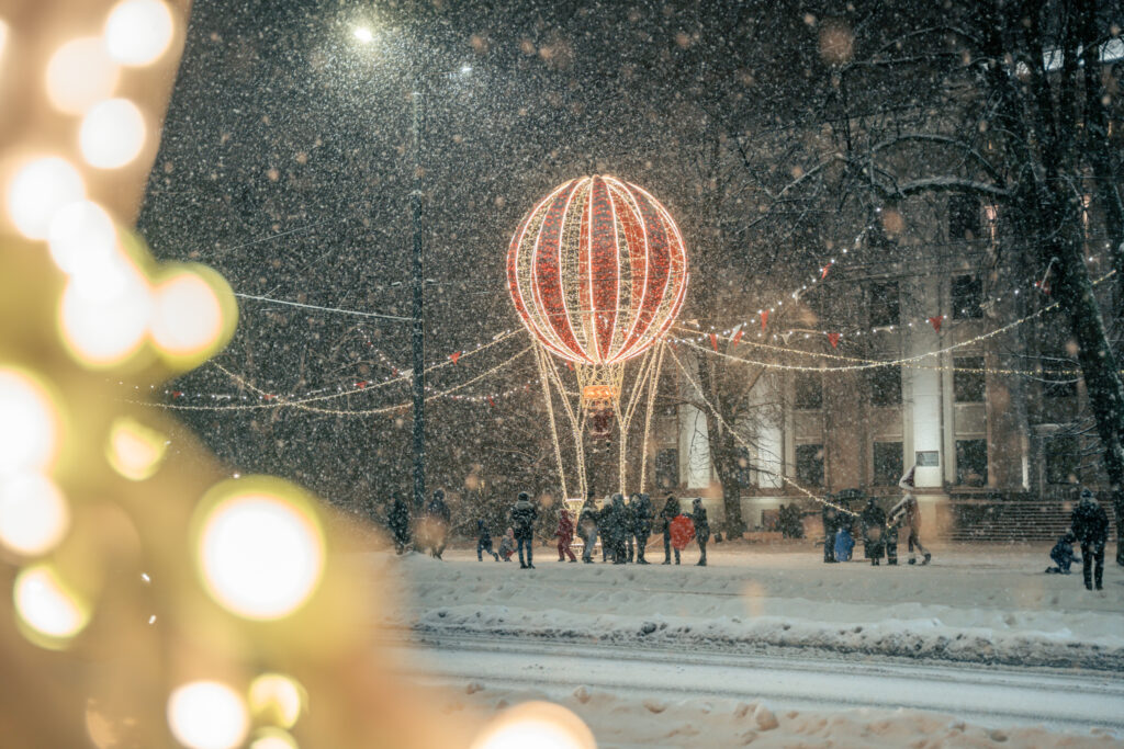 • Ejot pa Lielo ielu, visā tās garumā redzamas no gaisa balona izbirušas krāsainas egļu bumbas. Zvaigžņotas debesis ved pāri Tramvaja tiltam, bet eglīšu un lampiņu virteņu krelles ved virzienā uz koncertzāli “Lielais dzintars”.