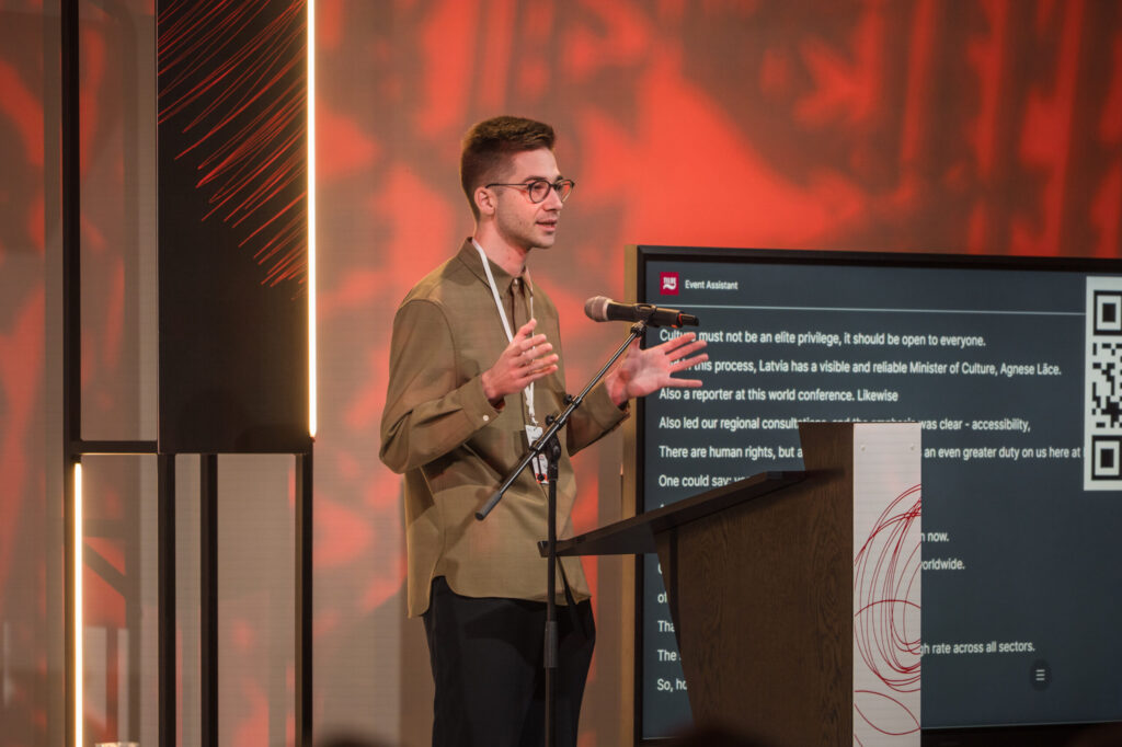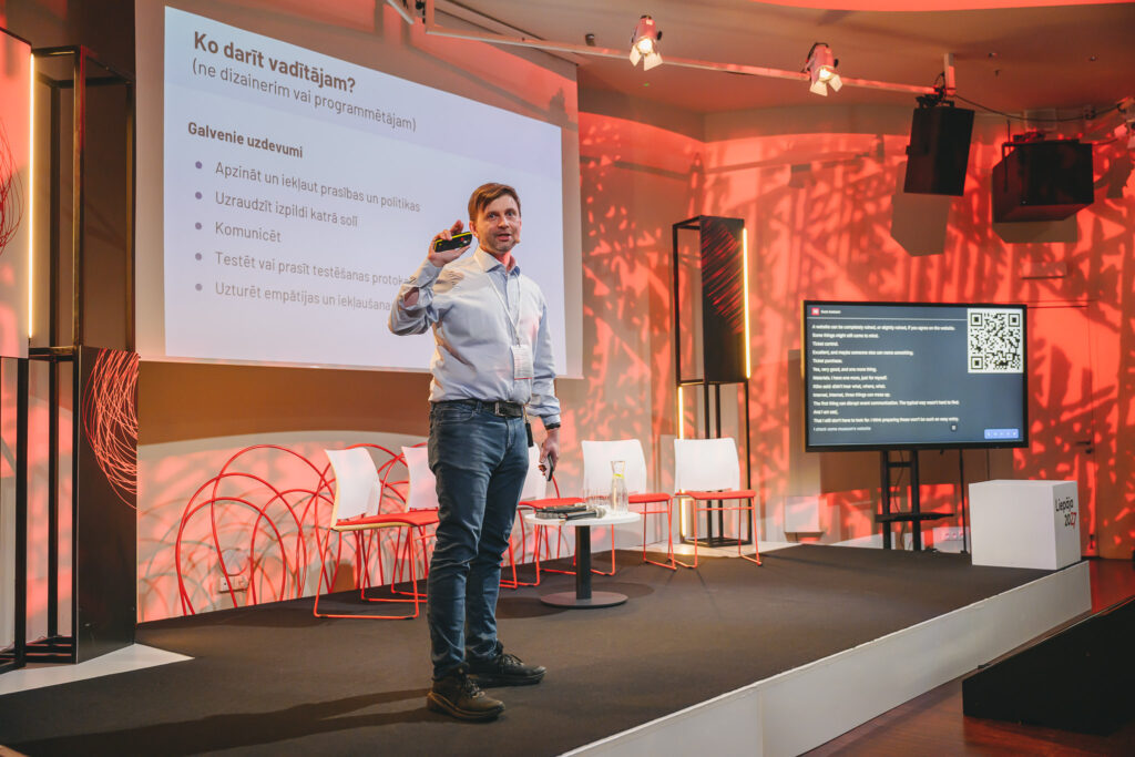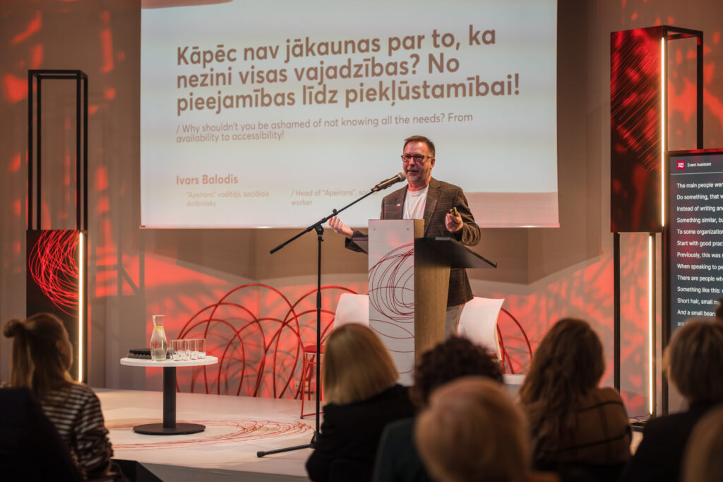 Savukārt Ivars Balodis no organizācijas “Apeirons” piekļūstamības ieviešanu salīdzināja ar uzvalka šūšanu, norādot, ka piekļūstamības risinājumiem ir jābūt cieņpilniem un pārdomātiem, lai tos var gan uzraudzīt, gan uzlabot. Tāpat viņš aicināja atcerēties, ka cilvēki ar invaliditāti nav tikai kultūras patērētāji; viņi ir arī aktīvi kultūras procesu dalībnieki – kultūras un mākslas radītāji, brīvprātīgie.