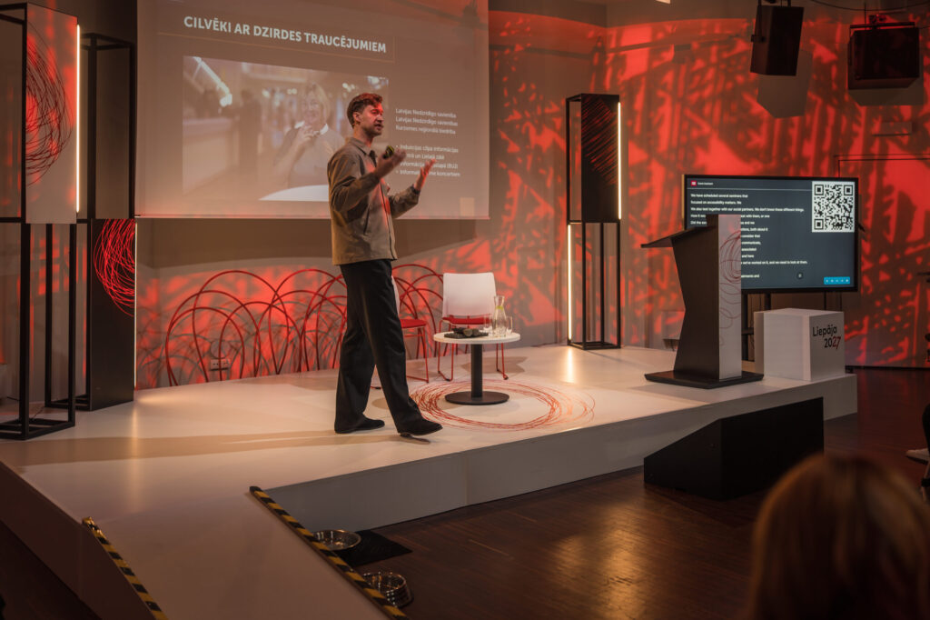 “Kā kultūras dzīves organizētāji un arī līdzcilvēki mēs esam atbildīgi par kultūras un mākslas pieejamību visiem. Pasaule šodien virzās uz priekšu ļoti strauji, kultūrai un mākslai ir spēks mūs nedaudz piebremzēt — lai sadzirdētu, pamanītu un rīkotos. Patiesa kultūras renovācija sākas tad, kad pieejamību un piekļūstamību redzam nevis kā pienākumu, bet kā iespēju — pārdomāt, kā mēs radām, dalāmies un augam,” atklājot konferenci, sacīja Liepāja 2027 mākslinieciskā vadītāja Baiba Bartkeviča.