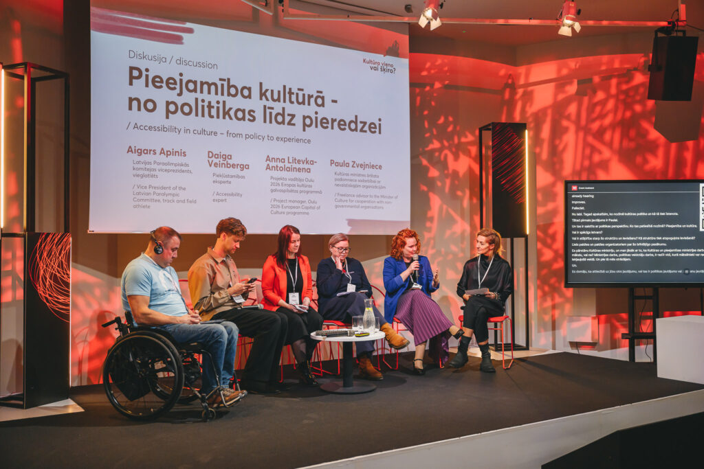 Norisinājās arī diskusija “Pieejamība kultūrā – no politikas līdz pieredzei”, kurā piedalījās Latvijas Paraolimpiskās komitejas viceprezidents, vieglatlēts Aigars Apinis, piekļūstamības eksperte Daiga Veinberga, Oulu 2026 projektu vadītāja Anna Litevka-Antolainena (Anna Litewka-Anttolainen) no Somijas un Kultūras ministres ārštata padomniece sadarbībai ar nevalstiskajām organizācijām Paula Zvejniece.