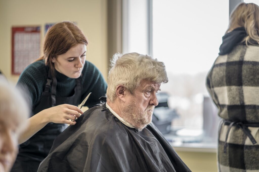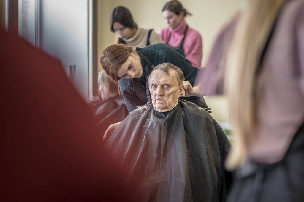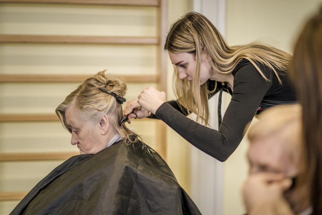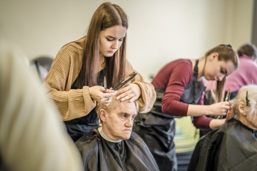 Viens pēc otra sirmgalvji priecīgi cēlās no friziera krēsla un atzina, ka jaunais matu griezums ļoti patīk un viņi jūtas pateicīgi par šo jauniešu dāvāto svētku sajūtu. Ar dažiem, kuriem mati atauguši kupli un gari, jaunajām praktikantēm nākas pacensties īpaši, talkā nāca arī skolotāja. Jaunietes arī pašas jutās gandarītas par savu veikumu, redzot prieku veco ļaužu acīs.
