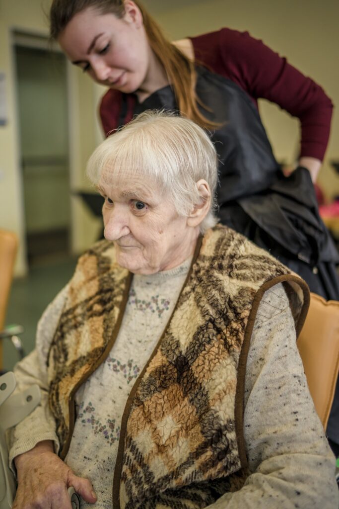 Vairāki seniori ieradās pie friziera riteņkrēslos vai ar nūjiņām, piepalīdzot aprūpētājām, bet dāma viscienījamākos gados bija Antaņina, kura šogad atzīmēs 95 gadu jubileju. Dažas seniores atzina, ka tagad pie friziera sanāk aiziet ļoti reti, kaut gan spēka gados tas apmeklēts regulāri vai pat katru nedēļu. Starp dāmām bija arī divi kungi, kuri arī posās, lai sveiktu sievietes svētkos.