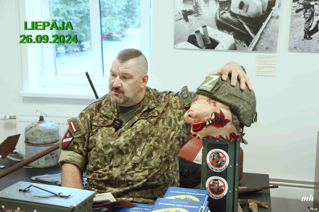 J. Slaidiņš dalījās savos pieredzes stāstos par Ukrainā pieredzēto, demonstrēja militāro ekipējumu un atbildēja uz jautājumiem par esošo situāciju dažādos frontes sektoros Ukrainā un dalījās ar ieteikumiem kā civiliedzīvotājiem izvērtēt situāciju un būt sagatavotiem dažādiem scenārijiem.