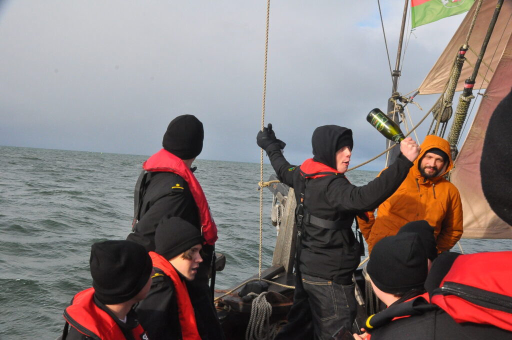 Buriniekam “Libava” izejot no ostas teritorijas, sākās svinīgā uzpleču pasniegšanas ceremonija. Vispirms audzēkņi visi kopā deva svinīgo solījumu jūrai. Pēc tam katrs audzēknis saņēma savus uzplečus. Pēc uzpleču uzlikšanas, katra grupa meta jūrā pudeli ar saviem vēlējumiem un vēstījumu jūrnieku brālībai.
