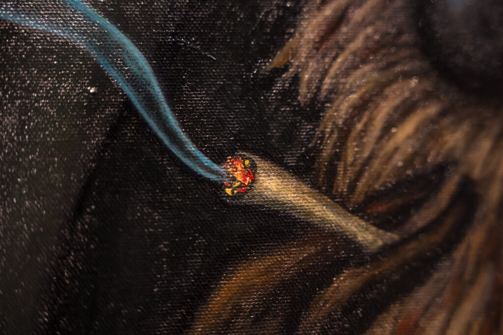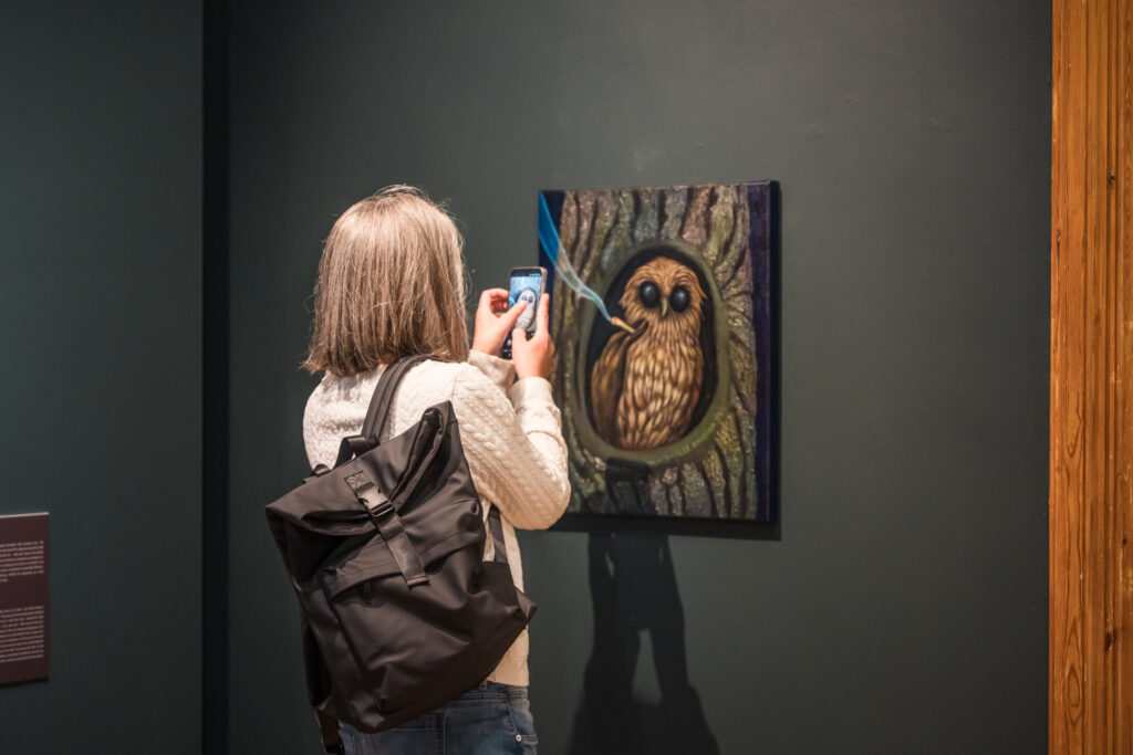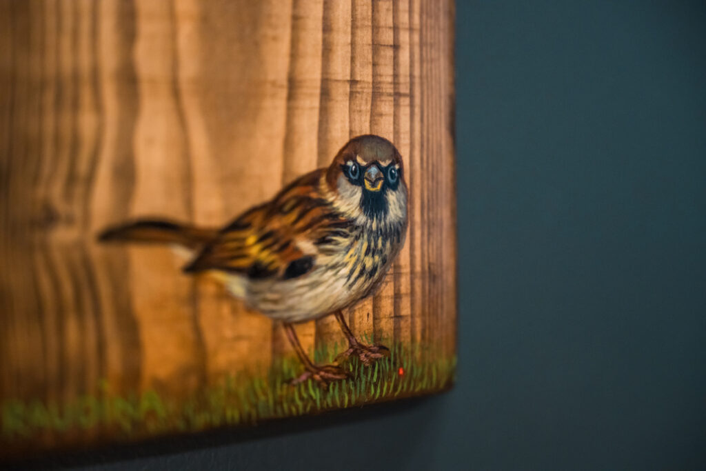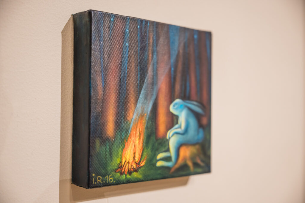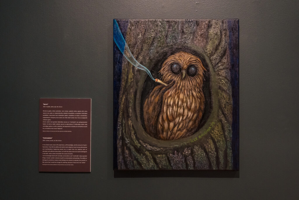 Kā izstādes atklāšanā atzina Ilze Raudiņa, katru gleznu papildina arī personīgs un emocionāls stāsts par to, ko māksliniece tajā ir iegleznojusi. Ieskatam – 2025. gada darbā “Apcere”, kurā pūce dūmo cigareti, anotācijā māksliniece raksta: “Brieduma gados, dzīves pieredzes, sevis izziņas un padarīto darbu apjoma dēļ esmu sajutusi savu spēju un nepieciešamību relaksēti noraudzīties uz daudzām cilvēciskām parādībām, izpausmēm man notiekošām apkārt, noskatīties no malas ar atsvešinātu, pašpietiekamu vērojumu, kā ar pūces aso redzi izšķirt tumsā – kas ir kas un prognozēt notikumu gaitu.