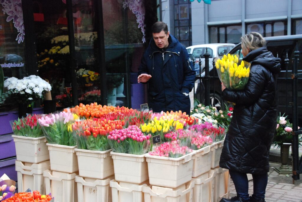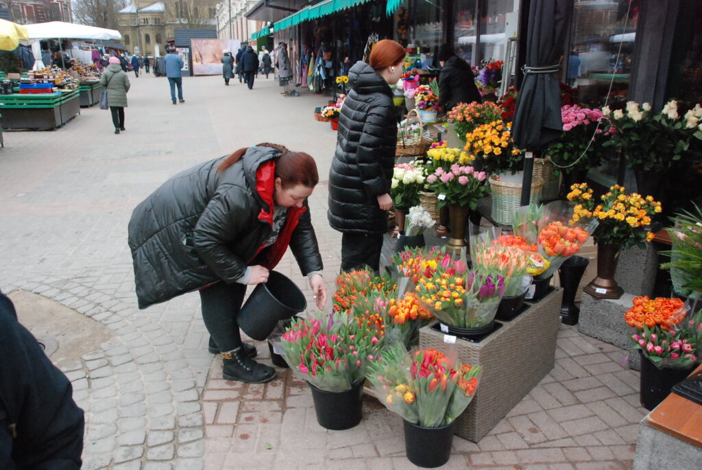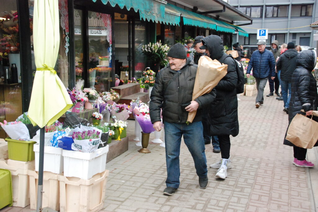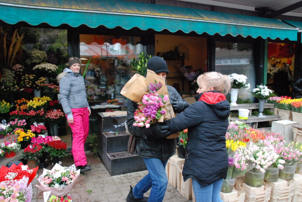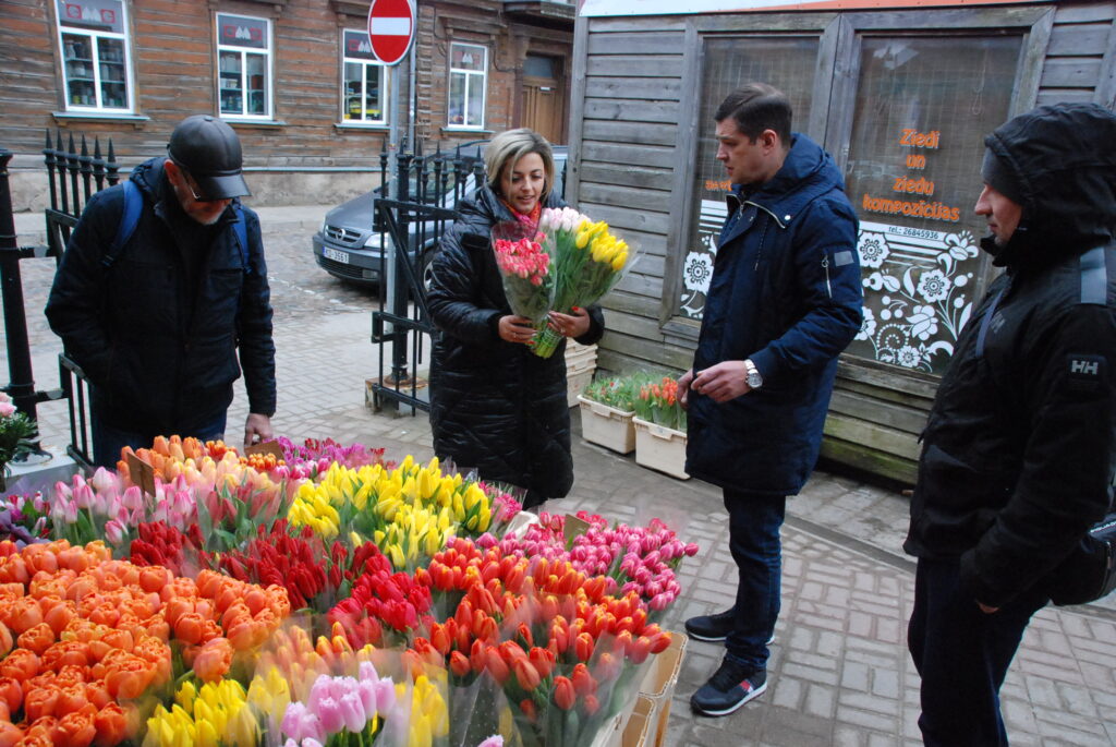 Ziedu tirgotāji bija sarūpējuši visdažādāko krāsu tulpes, vīrieši savām dāmām izvēlējās arī rozes un citus ziedus.