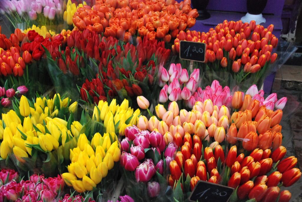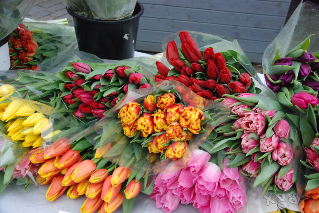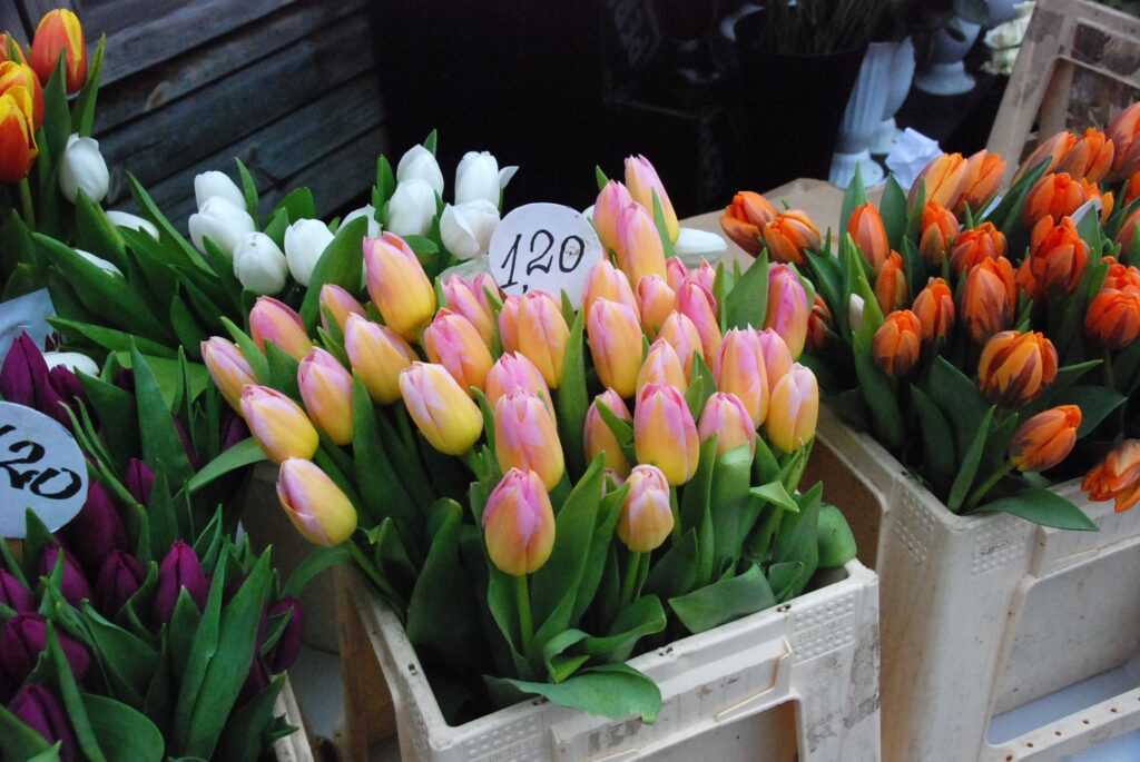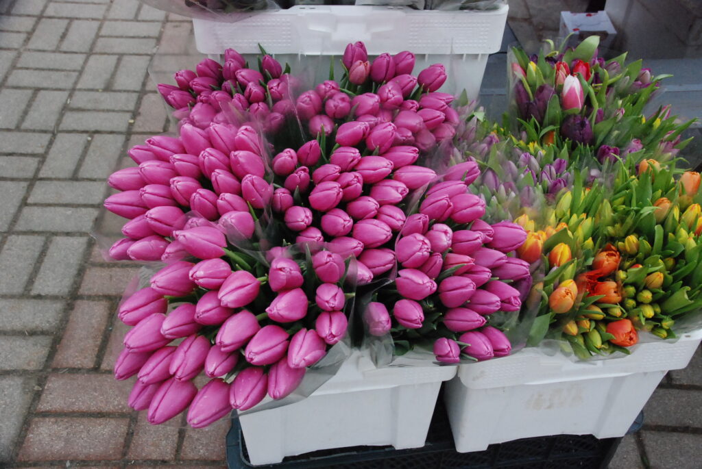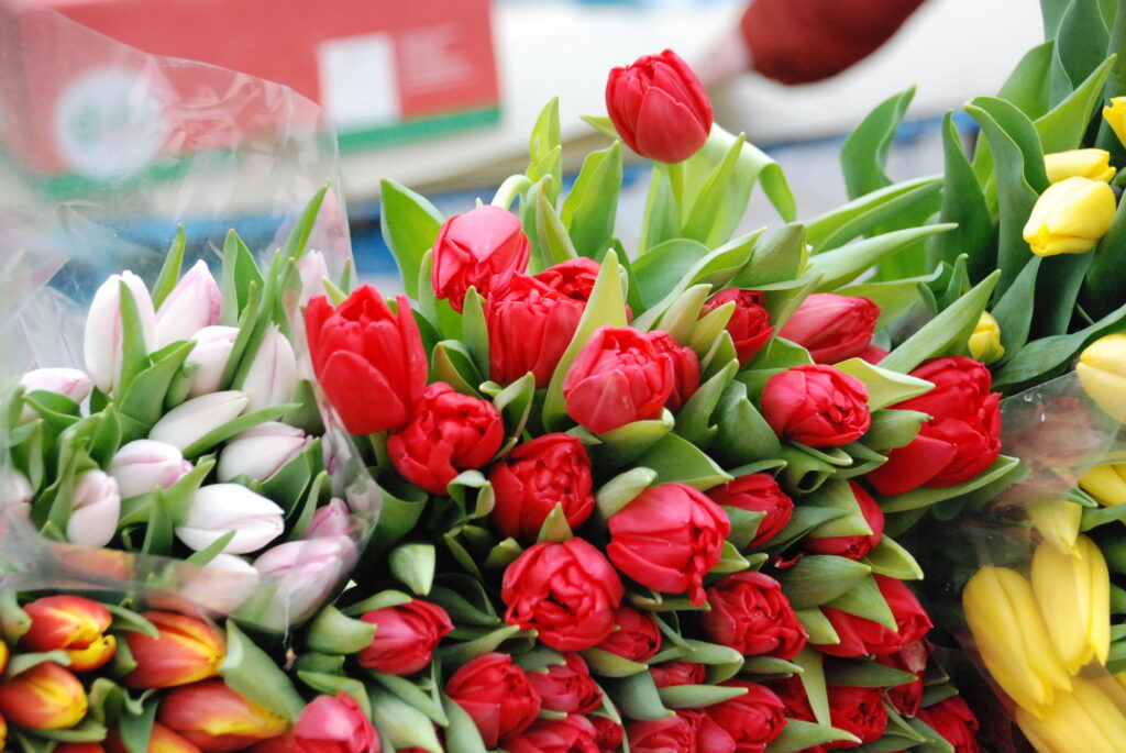 Ziedu tirgotāji bija sarūpējuši visdažādāko krāsu tulpes, vīrieši savām dāmām izvēlējās arī rozes un citus ziedus.
