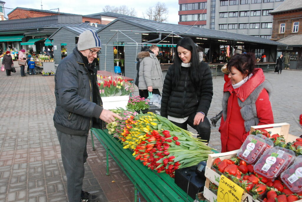 Ziedu tirgotāji bija sarūpējuši visdažādāko krāsu tulpes, vīrieši savām dāmām izvēlējās arī rozes un citus ziedus.
