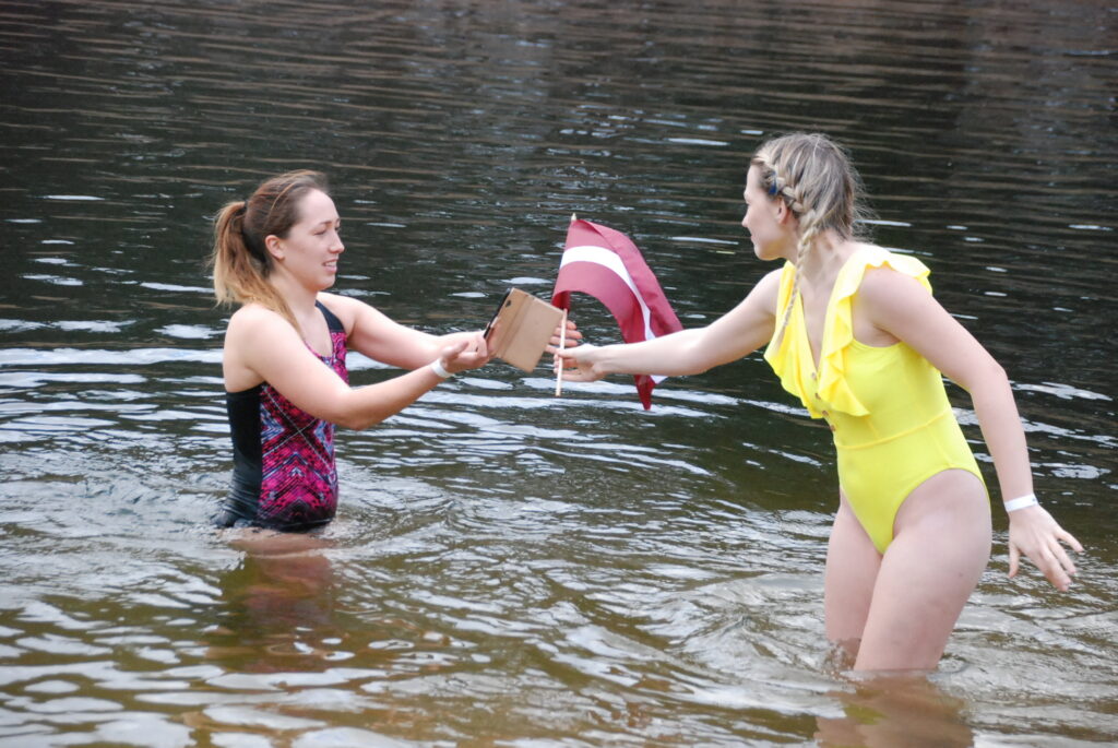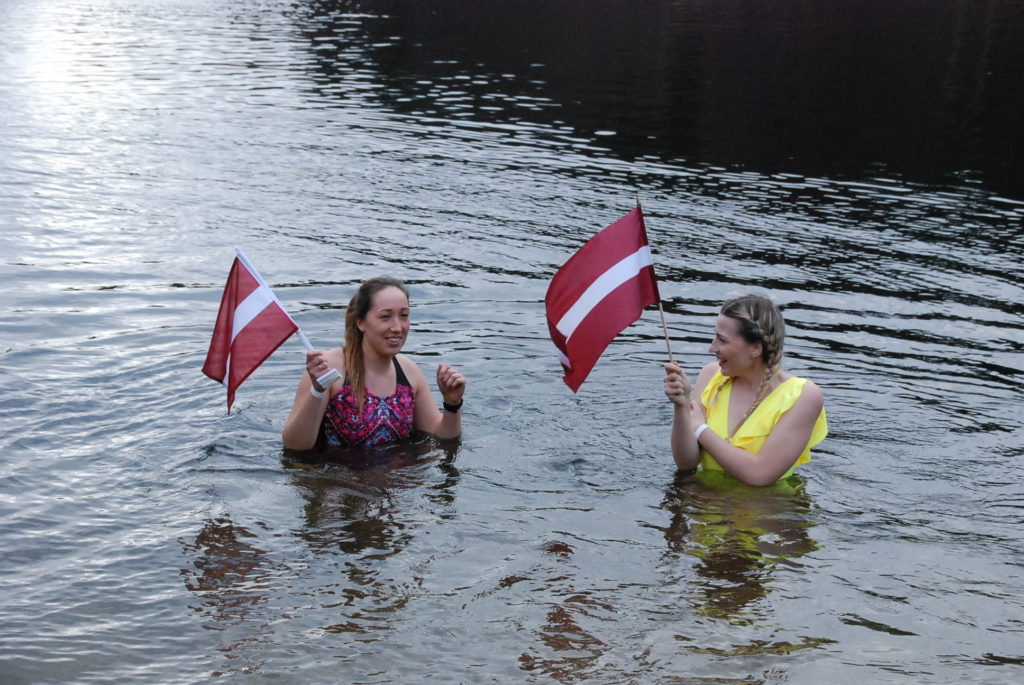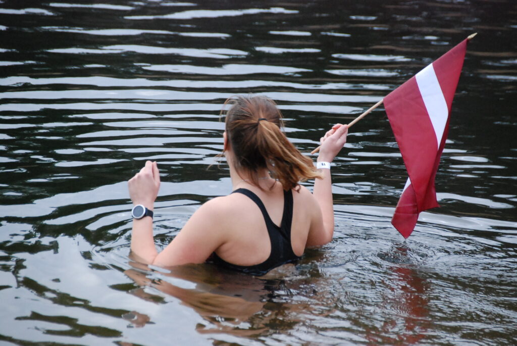 Roņi tika aicināti saposties par godu Latvijai. Liepājas veloaktīvistu un ziemas peldētāju klubs “VeloRonis” bija sarūpējis arī lielo Latvijas karogu un mazus karodziņus, lai dalībnieki varētu radīt skaistas bildes. Ūdens temperatūra ceturtdien Beberliņos bija 6.7 grādi, kas šoruden bija zemākā temperatūra ziemas peldētāju iecienītajā ūdenskrātuvē.