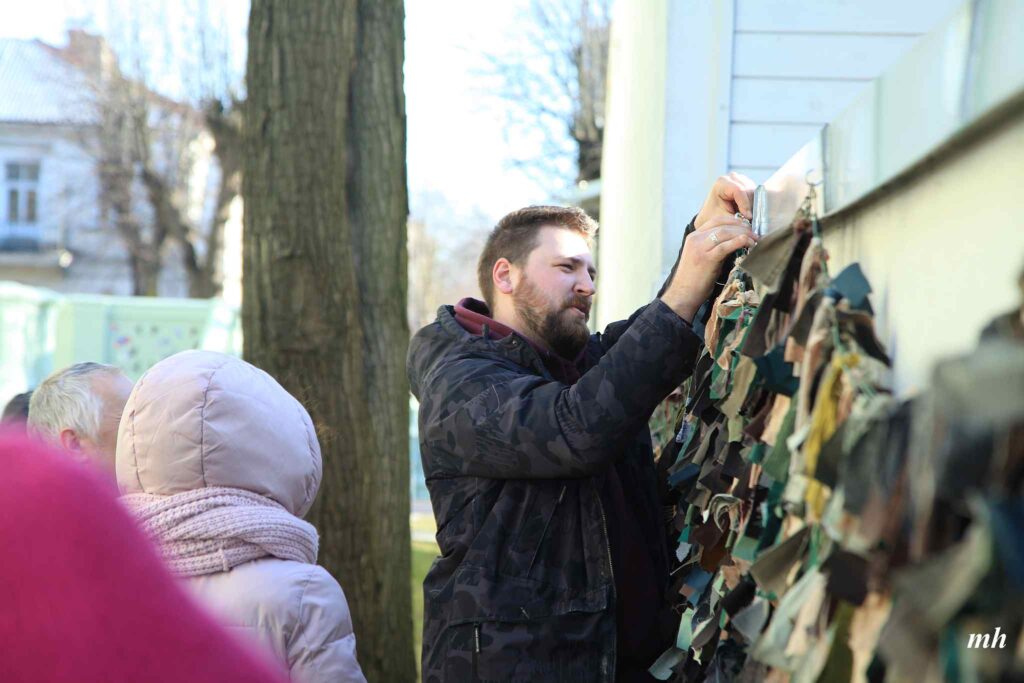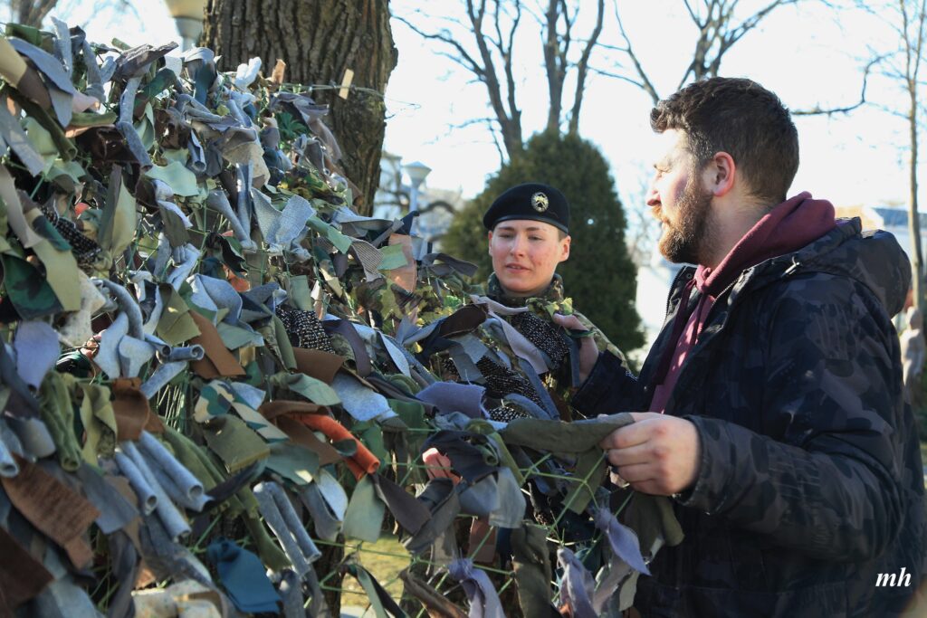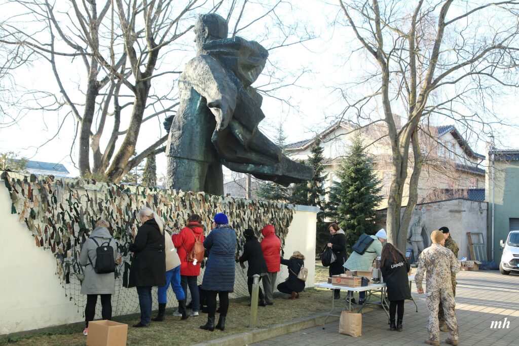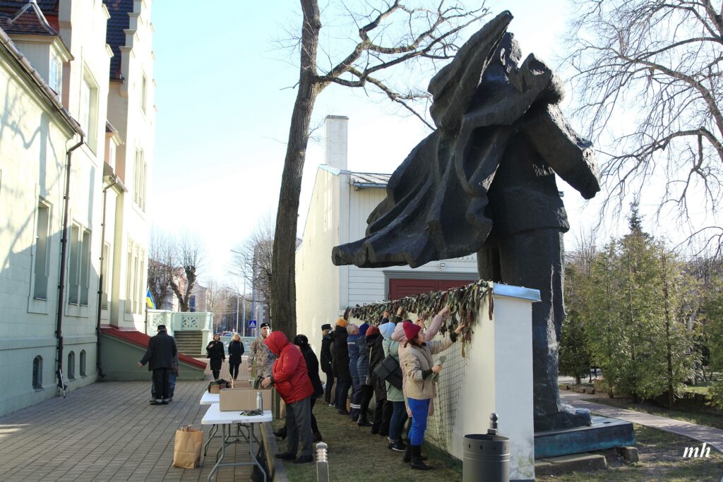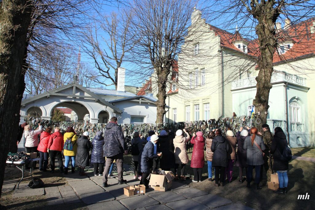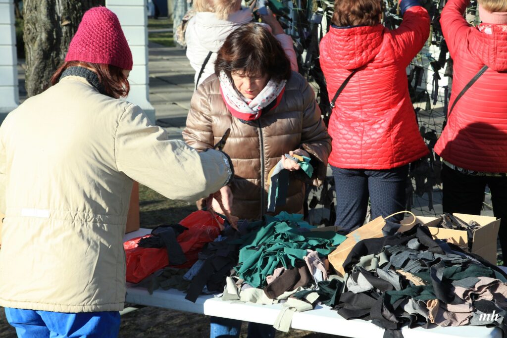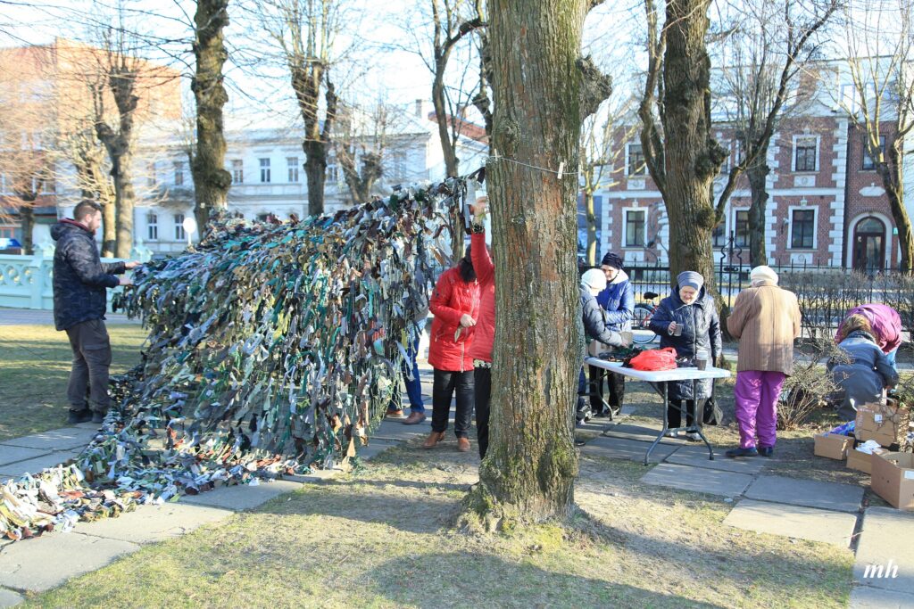 Fotoieskats Liepājas muzeja rīkotajā akcijā “Tu vari palīdzēt Ukrainai! Maskēšanās tīklu siešana. Piedalies, nepaliec malā!”, kas ceturtdien aizsākās muzeja dārzā.