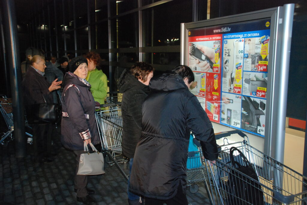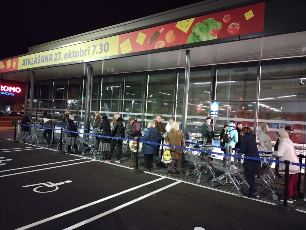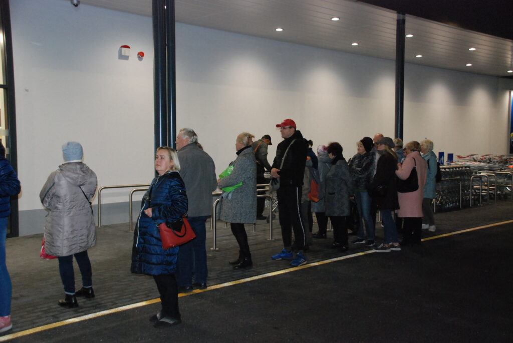 Pirmā rindā sāka stāvēt Dzintra Vircava, kura savā 78. dzimšanas dienā četros no rīta devās ārā no mājas, bet piecos jau bija pie veikala. Jaunais veikals tika atklāts pulksten 7.30. Jo tuvāk nāca atklāšanas brīdis, jo rinda pie veikala kļuva garāka. Pirmie veikalā vēlējās tikt aptuveni 100 pircēji.