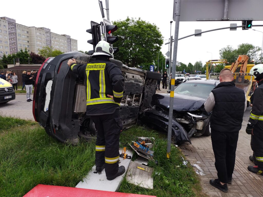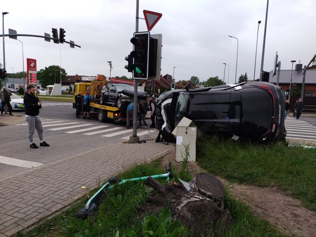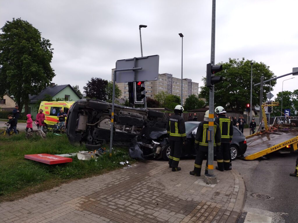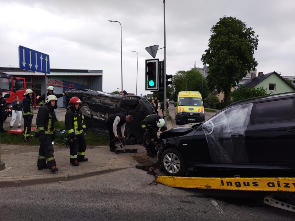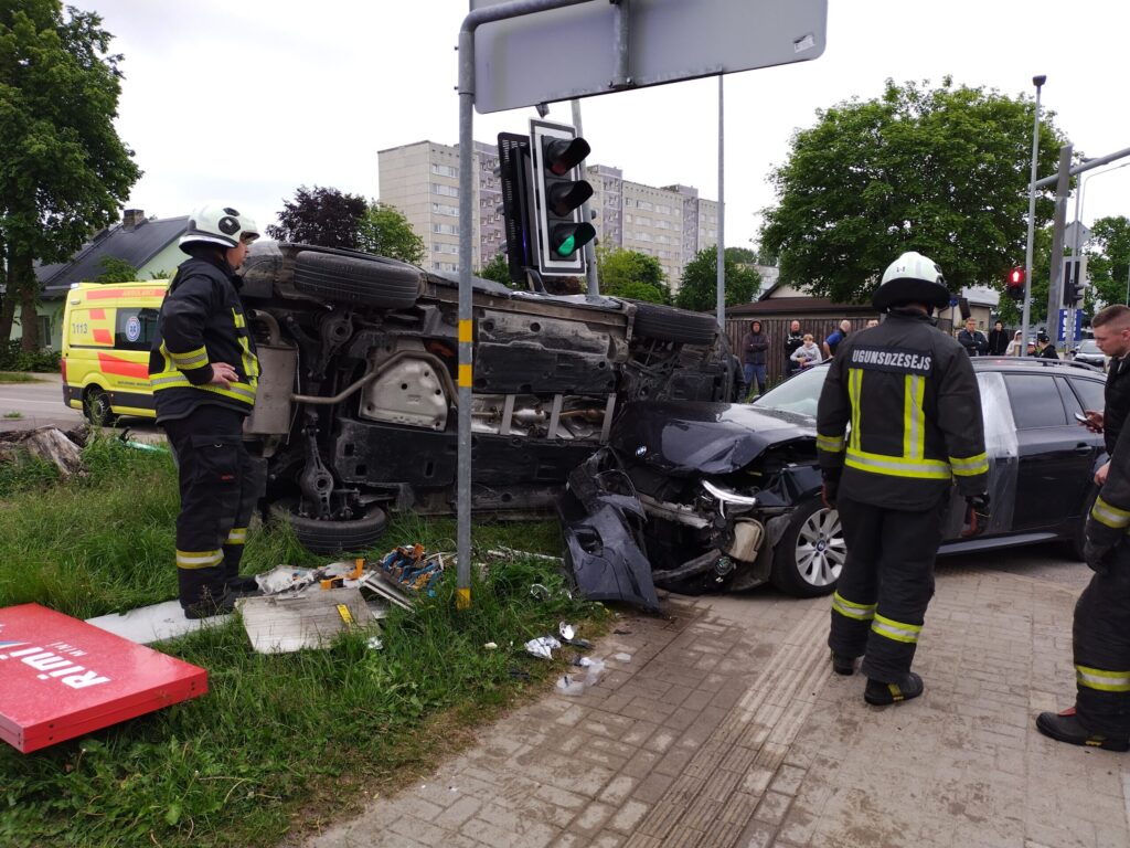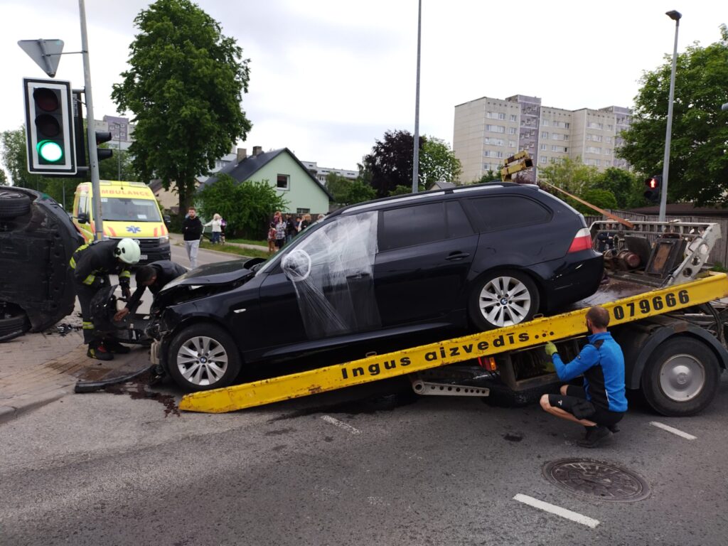 FOTO.VIDEO: Liepājā smaga avārija: "BMW" apgāž uz sāniem nomas uzņēmuma "CityBee" automašīnu