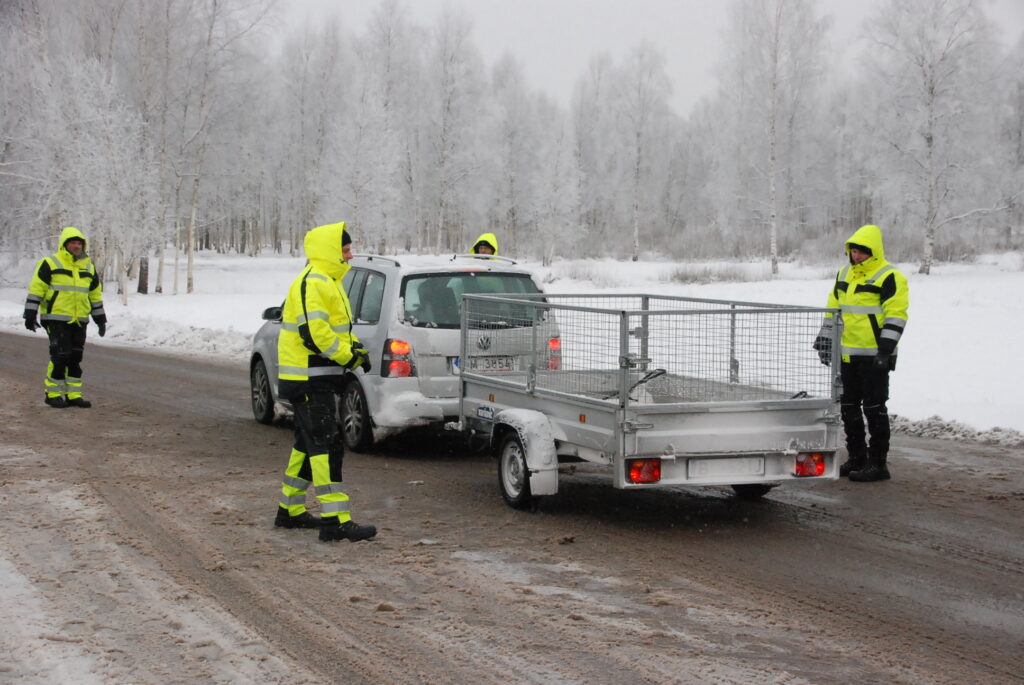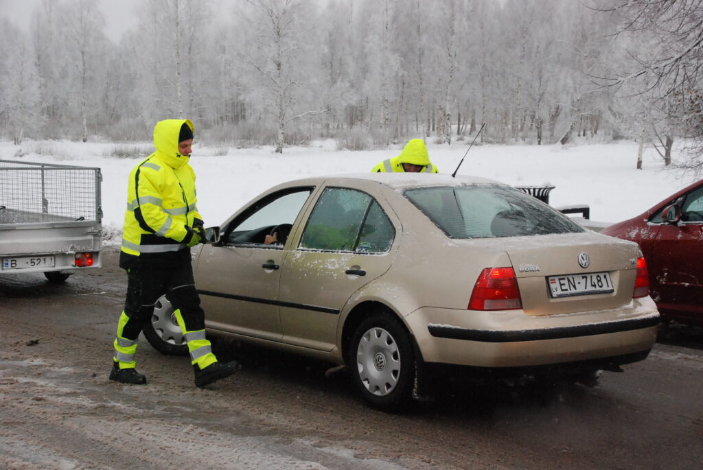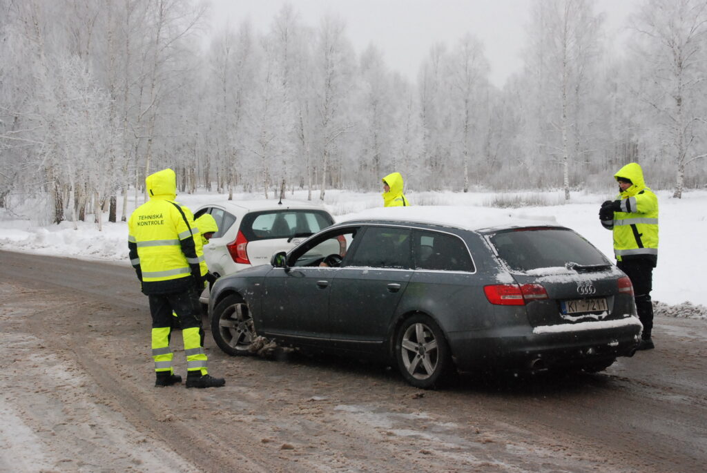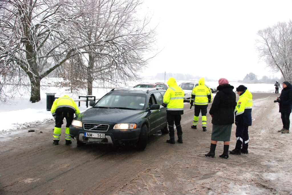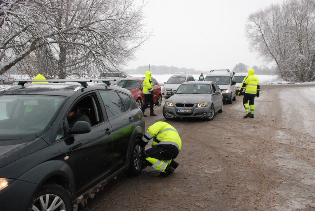Valsts policijas amatpersonas pie enkura aicināja autovadītājus iebraukt stāvlaukumā, kur notika riepu pārbaude.