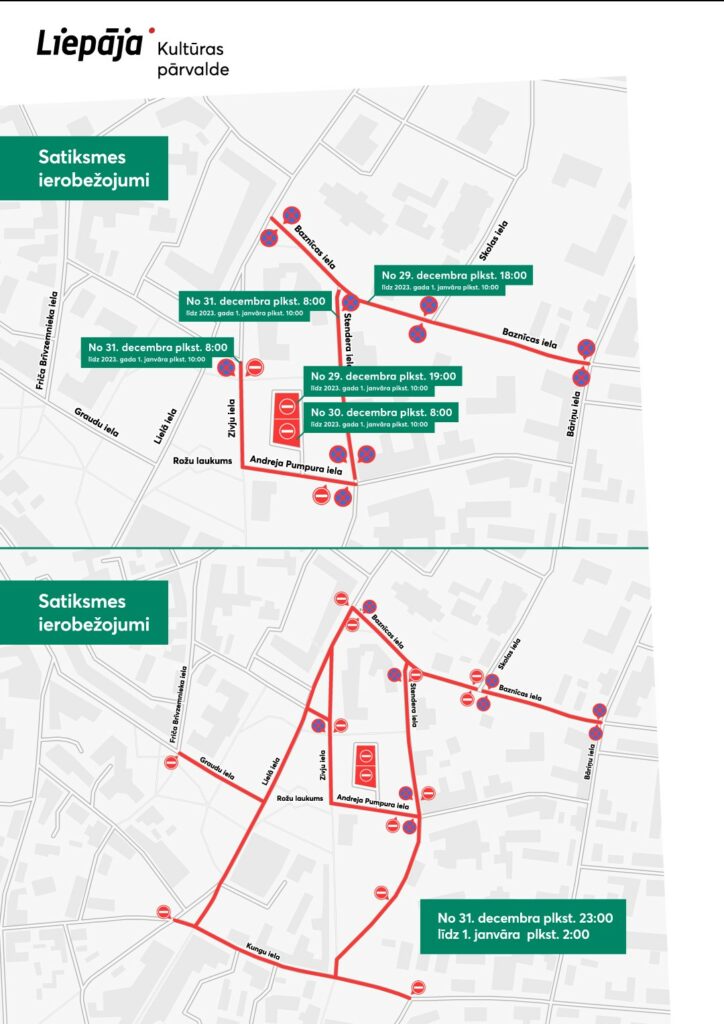 No 31.decembra plkst.23 līdz 2023.gada 1.janvāra plkst.2 tiks slēgta transporta kustība Lielās ielas posmā no Baznīcas ielas Rožu laukuma virzienā, Stendera ielā no Baznīcas ielas līdz Kungu ielai, Kungu ielā no Malkas ielas uz Lielās ielas pusi, Baznīcas ielā no Lielās ielas līdz Skolas ielai, saglabājot iespēju Baznīcas ielā iebraukt no Bāriņu ielas puses ar nogriešanos uz Skolas ielu, kā arī Graudu ielā no Fr. Brīvzemnieka ielas, saglabājot iespēju nogriezties uz Fr. Brīvzemnieka ielu.