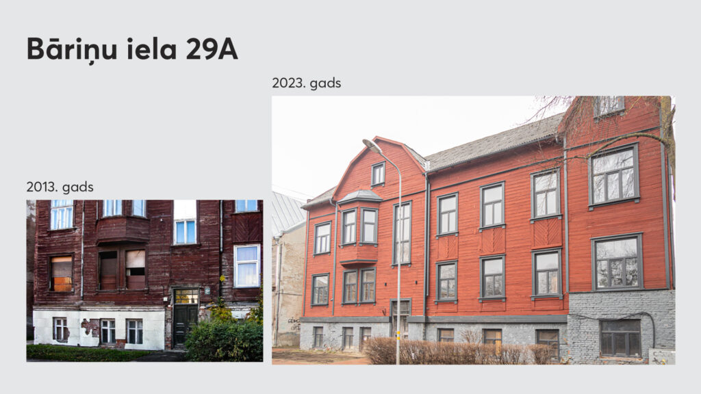 Ēkai Bāriņu ielā 24, kad pirms gada no dzīvokļu īpašnieku kopības ir nomainījies īpašnieks uz vienu personu – tas ir atvieglojis dažādu jautājumu risināšanu, un ir jau sākušies aktīvi īpašuma sakārtošanas darbi. Šobrīd jaunais īpašnieks plāno veikt ēkas restaurāciju un ir uzsācis ēkas arhitektoniski māksliniecisko izpēti. Bet turpat blakus, Bāriņu ielā 26, agrāk ilgstoši pamestai ēkai jaunais īpašnieks par saviem līdzekļiem veicis ēkas arhitektoniski mākslinieciskās izpētes un restaurācijas būvprojekta izstrādi, ar pašvaldības piešķirto līdzfinansējumu 2021. gadā veikta fasāžu un jumta restaurācijas 1. kārtas būvdarbi. Pašlaik īpašnieks par saviem līdzekļiem veic ēkas pārbūvi un fasāžu restaurāciju.