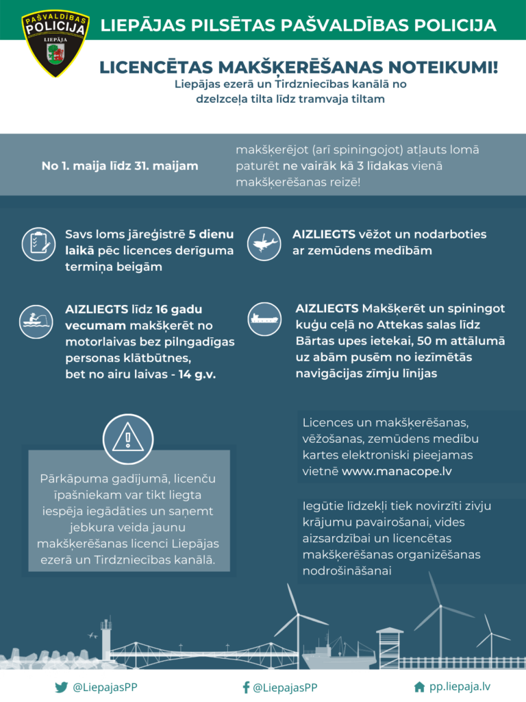 Liepājas pašvaldības policija atgādina, ka pārkāpuma gadījumā, licenču īpašniekam var tikt liegta iespēja iegādāties un saņemts jebkura veida jaunu makšķerēšanas licenci Liepājas ezerā un Tirdzniecības kanālā.