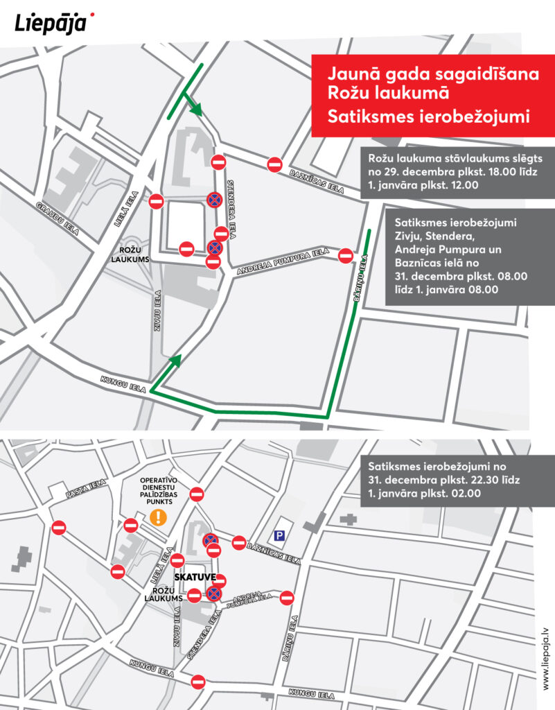 • Sakarā ar skatuves uzbūvi, no 29. decembra plkst. 18.00 līdz 2025. gada 1. janvāra plkst.12.00 pilnībā slēgts Rožu laukuma stāvlaukums;
