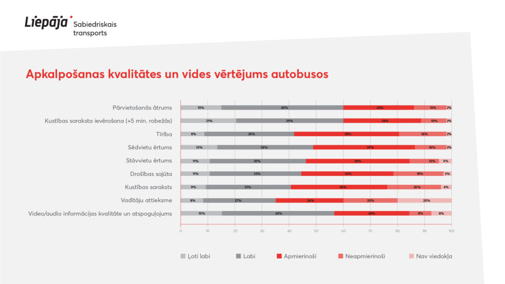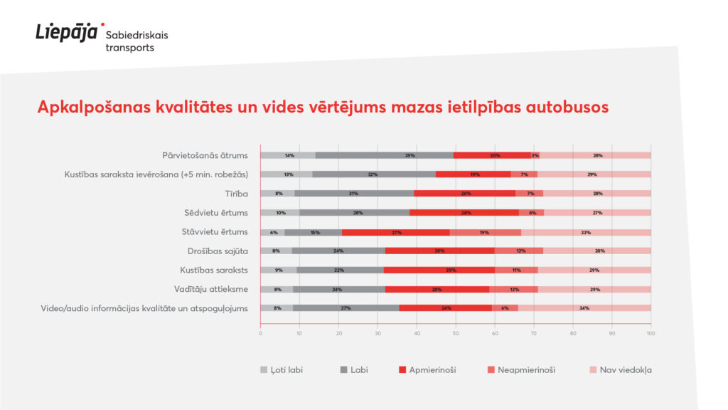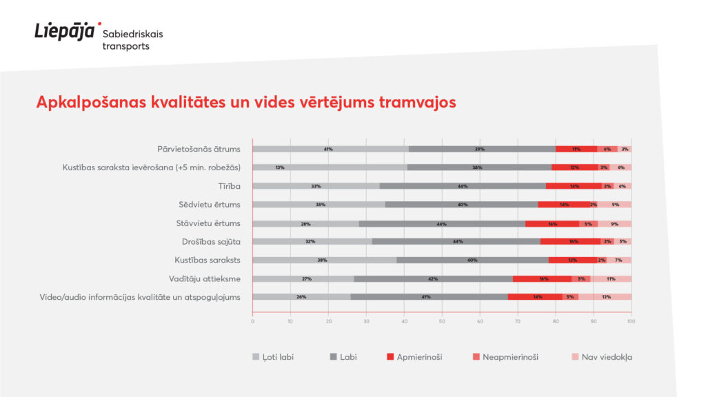 Vērtējot pārvietošanās ātrumu, kustības saraksta ievērošanu, tīrību transportlīdzeklī, sēdvietu ērtumu, stāvvietu ērtumu, drošības sajūtu, vadītāju attieksmi – pārliecinoši augstāks vērtējums izteikts par tramvaja pakalpojumiem, kur vērtējumu ļoti labi un labi izteikuši 67 līdz 80 % respondentu, autobusiem šis rādītājs ir no 35 līdz 60 %, bet mazas ietilpības autobusiem no 21 līdz 49 %.