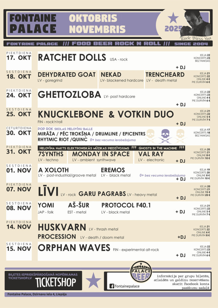 Piektdien, 24. oktobrī, uzstāsies GHETTOZLOBA, kas šogad tika nominēta GAMMA balvai metālmūzikas kategorijā, savukārt 26. oktobrī Fontaine Palace skatuvi atdzīvinās somu duets Knucklebone Oscar & Niko Votkin, divi virtuozi, kas piedāvās autentisku rokenrola programmu ar pasaules ceļojumu pieredzi un spilgtu šovu.