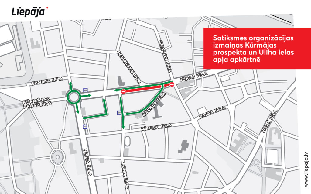 No pirmdienas, 4. septembra, Liepājā satiksmei atkal būs atvērts Kūrmājas prospekta un Uliha ielas krustojums, kur tagad ir izbūvēts rotācijas aplis. Autovadītāji un citi satiksmes dalībnieki ir aicināti ievērot jaunās ceļu satiksmes zīmes un citas norādes!