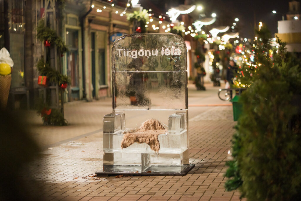 Pie Tirgoņu ielas 21 nama apskatāma “Frostiart Baltic” meistaru radītā ledus skulptūra, kas aicina ne tikai apbrīnot to, bet arī uzņemt foto ar pilsētas ainavu fonā.