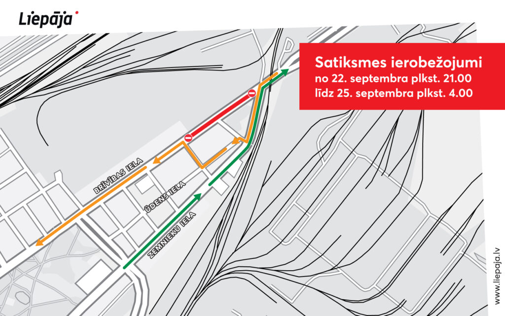 No piektdienas, 22. septembra, pulksten 21 līdz pirmdienas, 25. septembra, pulksten četriem rītā slēgto satiksmi Brīvības ielā varēs apbraukt pa Zemnieku – Ūdens – Ķēžu ielu.