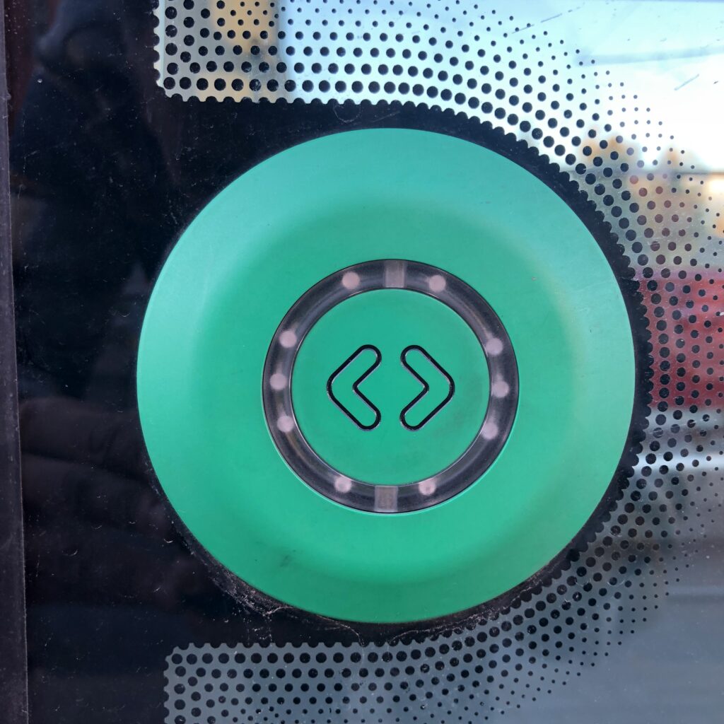 Poga ir izvietota uz visu tramvaja durvju stiklotās daļas un, tramvajam apstājoties, tā tiek izgaismota ar mirgojošu LED apgaismojumu uzmanības pievēršanai. Tāpat uz durvīm ir izvietotas uzlīmes ar norādēm par pogas nospiešanu, ja nepieciešams atvērt durvis.