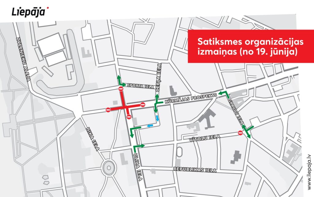 Liepājā, turpinot darbus pie Uliha ielas un Kūrmājas prospekta krustojuma pārbūves par rotācijas apli, no 19. jūnija līdz 31. jūlijam tiks slēgta satiksme šo ielu krustojumā, apbraukšanas ceļš būs pa tuvējām ielām. Liepājas pašvaldība aicina autovadītājus sekot līdzi izvietotajām ceļazīmēm!