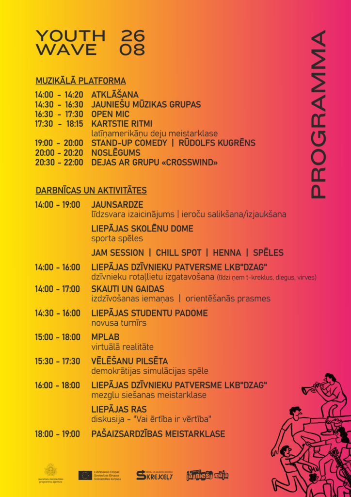 Festivāla “Youth wave” programmu sastāda dažāda veida aktivitātes un darbnīcas, kā arī izklaidējoša un muzikāla programma uz galvenās platformas. Festivāla piedāvājumā – MPLab ar virtuālo realitāti, “Skauti un gaidas” ar izdzīvošanas prasmēm, Jaunsardze ar līdzsvara izaicinājumu un ieroču salikšanu/izjaukšanu, dzīvnieku patversme LKB “DZAG” piedāvās radošas darbnīcas, lai izveidotu spēļmantas mīluļiem, Liepājas Universitātes studentu padome ar novusa turnīru, Liepājas Skolēnu dome piedāvās gan sportiskas aktivitātes, gan diskusijas un informācijas apmaiņu, Liepājas Jauniešu padome ar izklaidējošām aktivitātēm, Liepājas RAS pastāstīs par noderīgām lietām dabas saaudzēšanā, būs “JAM session”, pašaizsardzība, demokrātijas simulācijas spēle ”Vēlēšanu pilsēta”, diskusijas, spēles, deju meistarklase “Karstie ritmi”, hennas darbnīca, “Open mic”, “Stand-up Comedy” ar Rūdolfu Kugrēnu, dejas ar grupu “Crosswind” un vēl citas jauniešiem saistošas aktivitātes.