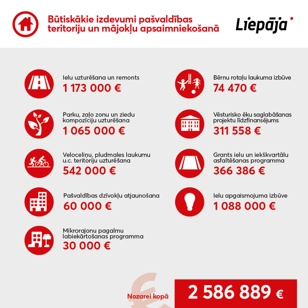 25,6% jeb 30 miljoni eiro paredzēti ekonomiskās darbības nodrošināšanai. 1 173 000 eiro plānoti ielu infrastruktūras uzturēšanai un remontdarbiem, nedaudz virs 1 miljona eiro – parku un zaļo zonu uzturēšanai, par 60 000 eiro veiks pašvaldības dzīvokļu atjaunošanu, tāpat plānots turpināt mikrorajonu pagalmu labiekārtošanas programmu, kam paredzēti 30 000 eiro, jaunu bērnu rotaļu laukumu izveidei – 74 470 eiro. Nākamgad pašvaldība ar 311 558 eiro līdzfinansēs kultūras pieminekļu saglabāšanu, 366 386 eiro atvēlēti grants ielu un iekškvartālu asfaltēšanas programmas īstenošanai, ielu apgaismojuma izbūvei piešķirti 1 088 000 eiro.
