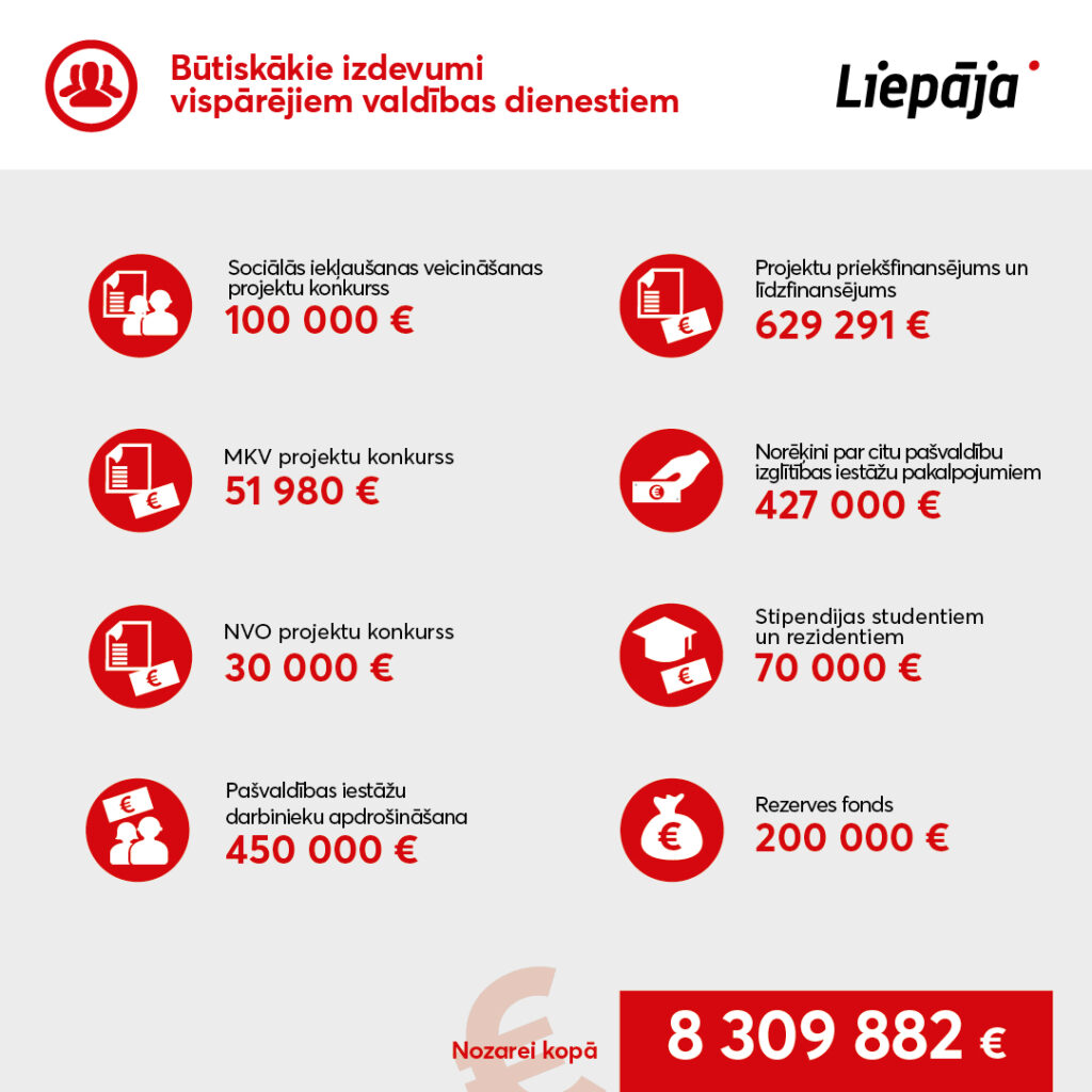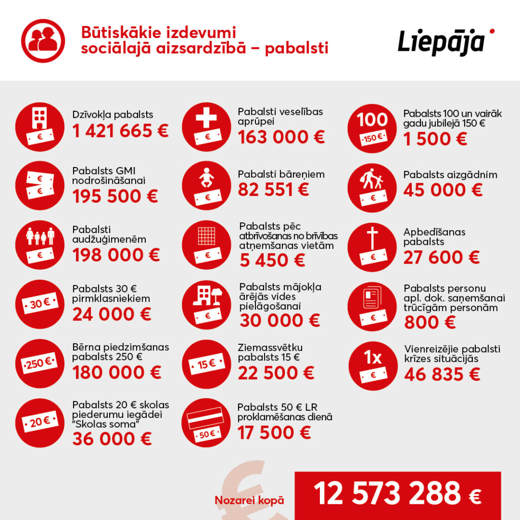 12,5 miljonus eiro jeb nepilnus 11% no visa pašvaldības budžeta paredzēts atvēlēt sociālajai aizsardzībai. Liepājas pašvaldība turpinās nodrošināt dažādus pabalstus, lai liepājnieki jūtas sociāli aizsargāti – tiks sniegti dzīvokļa pabalsti, pabalsti audžuģimenēm, pirmklasniekiem, veselības aprūpei, pabalsti garantētā minimālā ienākuma nodrošināšanai, bērna piedzimšanas un apbedīšanas pabalsti un citi.