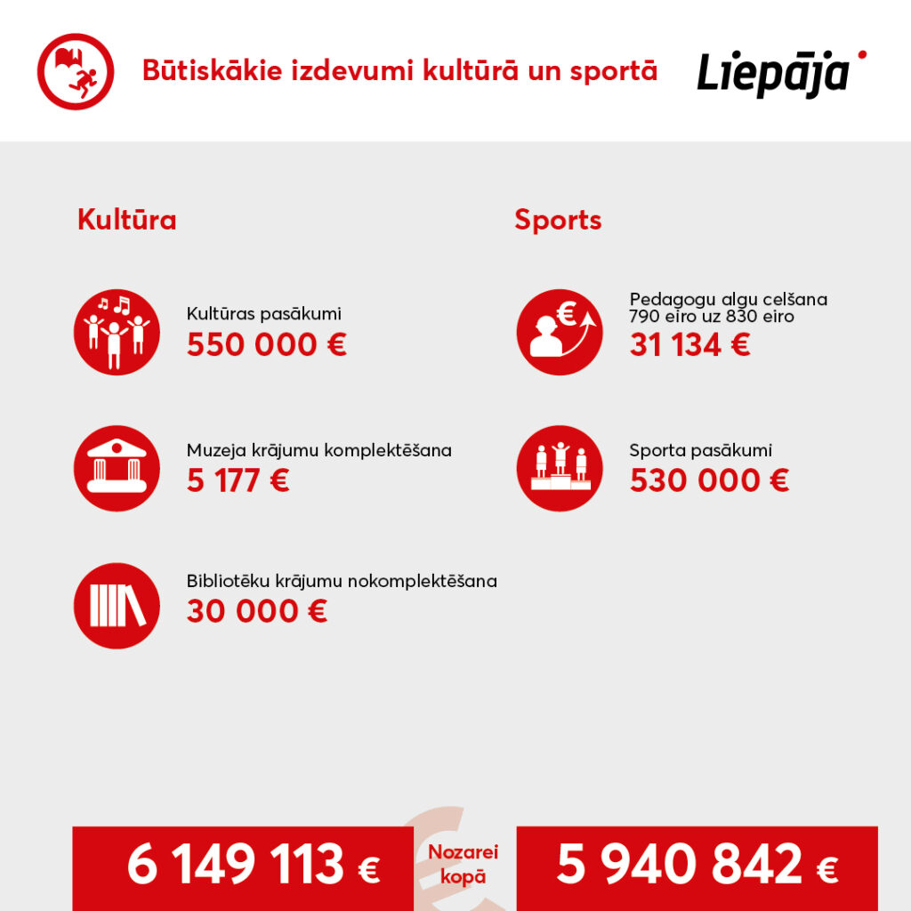Aptuveni 5% no budžeta jeb nepilni 6 miljoni eiro paredzēti sporta nozarei. Deputāti atbalstīja 530 000 eiro piešķiršanu sporta pasākumiem, pedagogu algas palielinājumu no 790 uz 830 eiro par likmi un nodrošināšana visam gadam, 51 868 eiro atvēlēs darba samaksas palielinājumam 10% robežās sporta nozarē strādājošajiem.