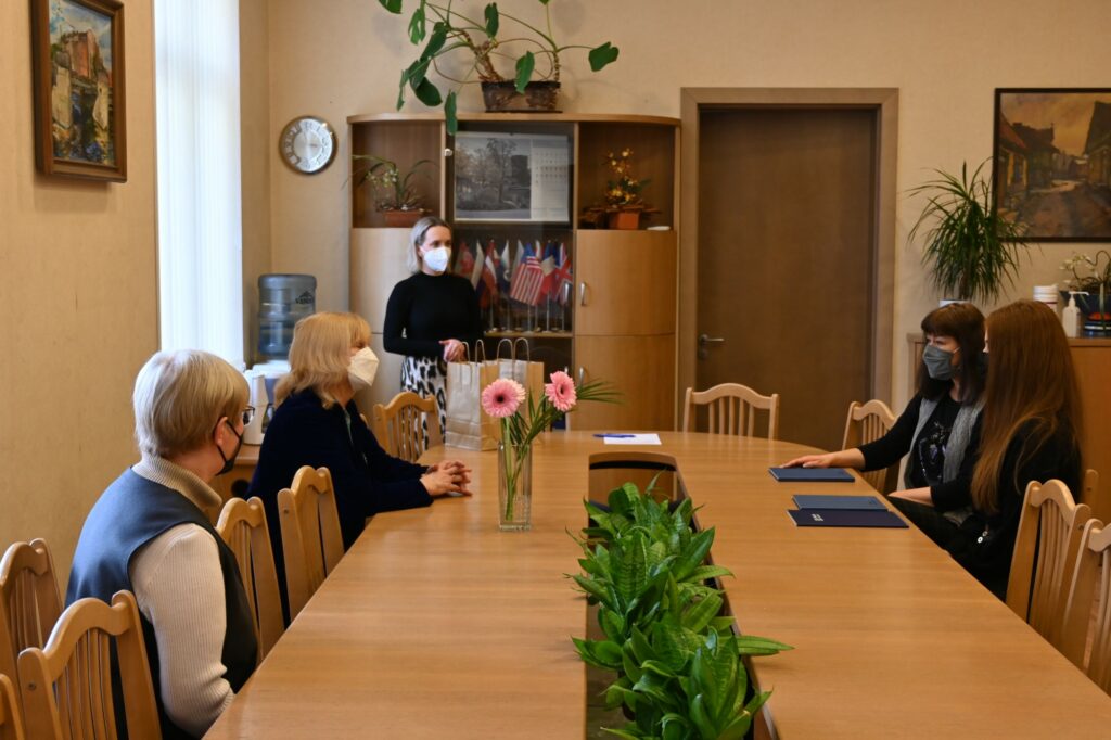 LiepU rektore Dace Markus sarunā ar Plūdoņa Kuldīgas vidusskolas direktora vietnieci audzināšanas darbā Sangritu Upenieci, kura absolvējusi LiepU, pārrunāja darba nianses skolā, skolēnu mācīšanās ieradumus un “Skola 2030” programmu.