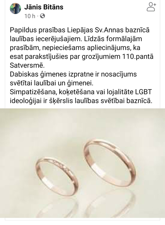 “Līdzās formālajām prasībām, nepieciešams apliecinājums, ka esat parakstījušies par grozījumiem 110.pantā Satversmē. Dabiskas ģimenes izpratne ir nosacījums svētītai laulībai un ģimenei. Simpatizēšana, koķetēšana vai lojalitāte LGBT ideoloģijai ir šķērslis laulības svētībai baznīcā,” pausts paziņojumā.