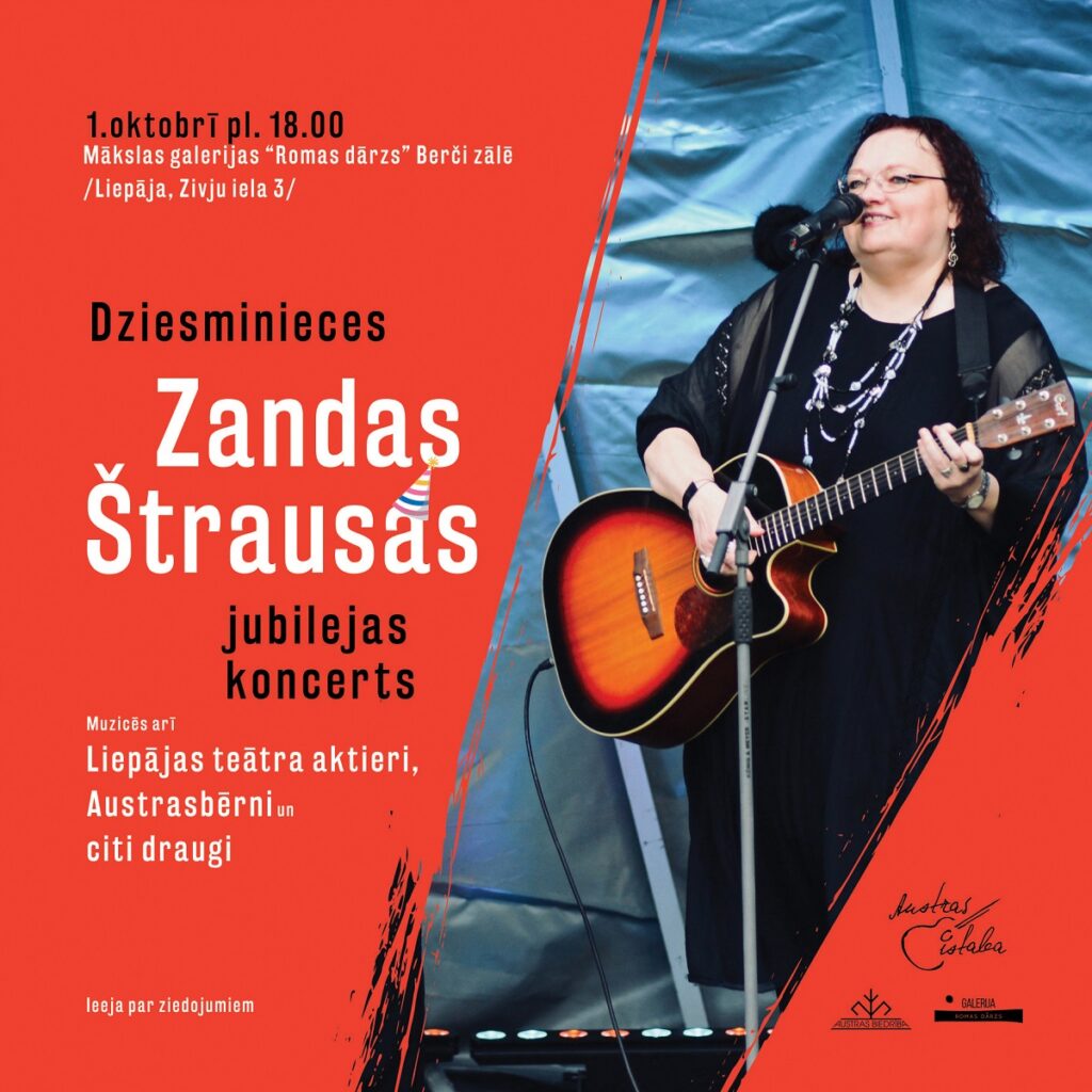 Sestdien, 1. oktobrī, pulksten 18 Liepājā, mākslas galerijas “Romas dārzs” Berči zālē, savu pusapaļo jubileju kopā ar muzikāli talantīgiem draugiem skanīgā koncertā atzīmēs dziesminiece, aktrise un vienkārši labs cilvēks Zanda Štrausa. Ieeja par ziedojumiem.