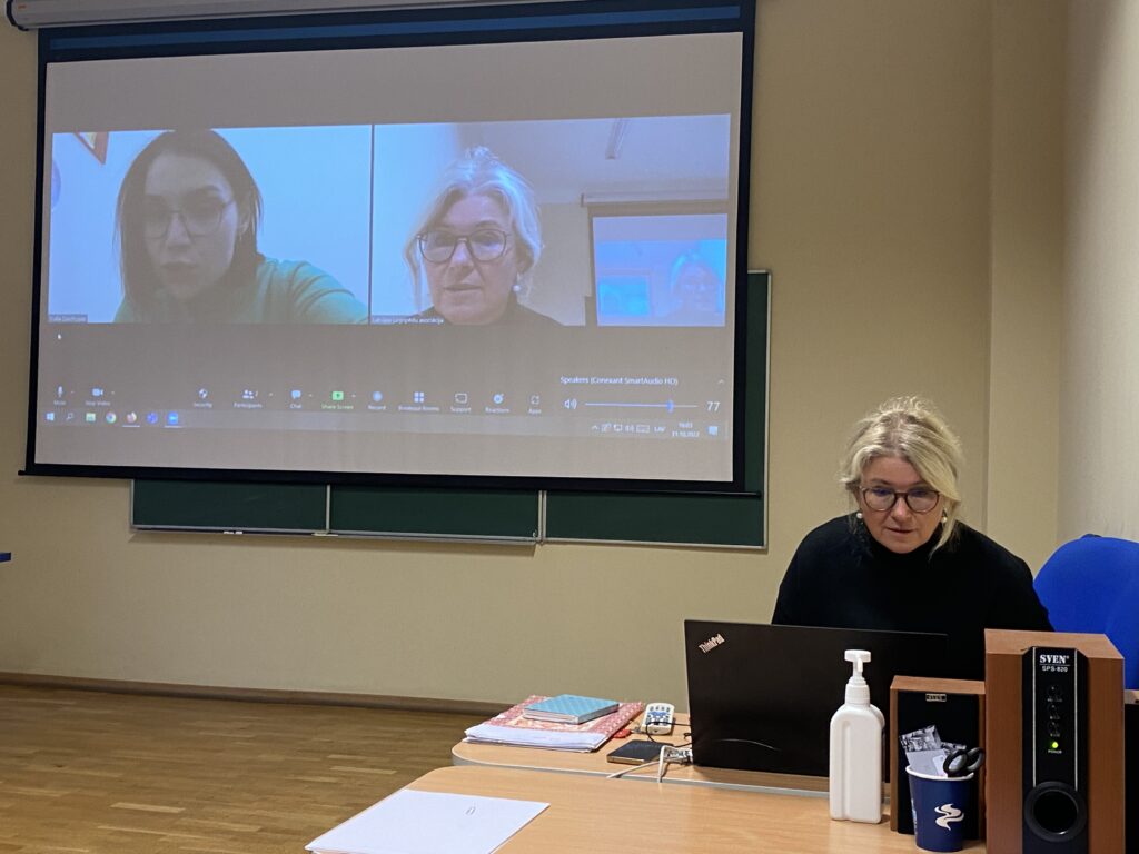 Sarunas sākums bija emocionāls abām pusēm – Jūlijai stāstot un studentēm un pasniedzējai uzklausot: “Šodien bija nemierīga diena: visu dienu skan gaisa trauksme, tagad ir apstājusies, pa dienu bija apšaudes, nav ūdens un elektrības, labi, ka tikām pie interneta pieslēguma.”