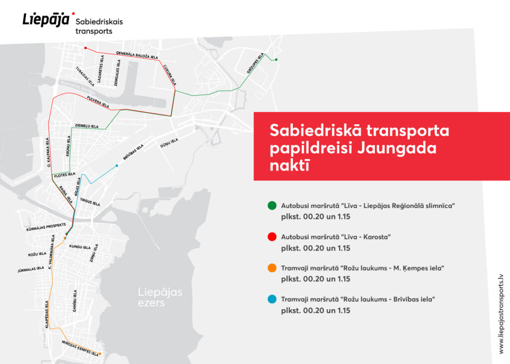 Pēc Jaunā gada sagaidīšanas Rožu laukumā no pieturvietas “Līva” tiks organizēti astoņi papildu autobusa reisi. Plkst. 00.20 un 1.15 pa diviem reisiem maršrutā “Līva – Liepājas Reģionālā slimnīca” (kā 6. maršruts, sākot no pieturvietas “Līva”): Lielā iela – Raiņa iela – Flotes iela – Krūmu iela – Ziemeļu iela – Ventspils iela – Pulvera iela – Cukura iela – Grīzupes iela – Slimnīca. Un pa diviem reisiem plkst. 00.20 un 1.15 maršrutā “Līva – Karosta”: Lielā iela – Raiņa iela – O. Kalpaka iela – Pulvera iela – Cukura iela – Ģenerāļa baloža iela – Atmodas bulvāris, portālu “ReKurZeme” informē Liepājas pilsētas pašvaldības aģentūra “Liepājas sabiedriskais transports”.