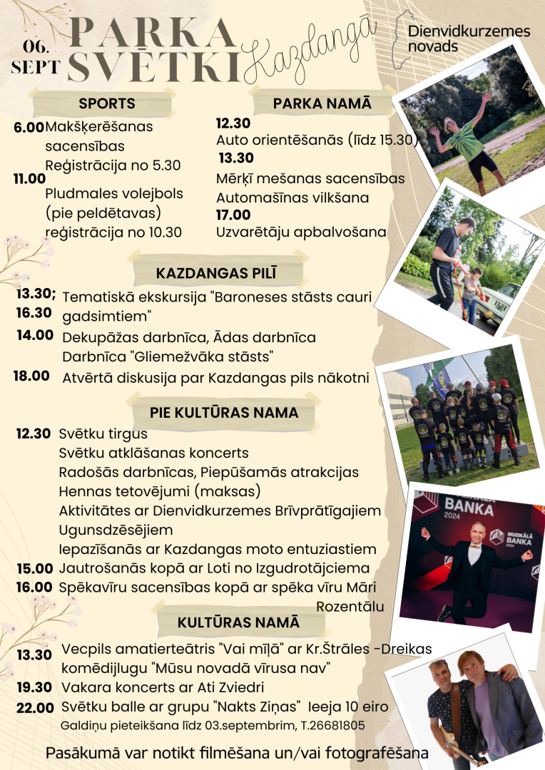 Sestdien, 6. septembrī, Kazdangā norisināsies rudens ieskaņas tradicionālie svētki – Kazdangas parka svētki, kas šogad piedāvās daudzveidīgu programmu gan sporta, gan kultūras, gan izklaides cienītājiem.