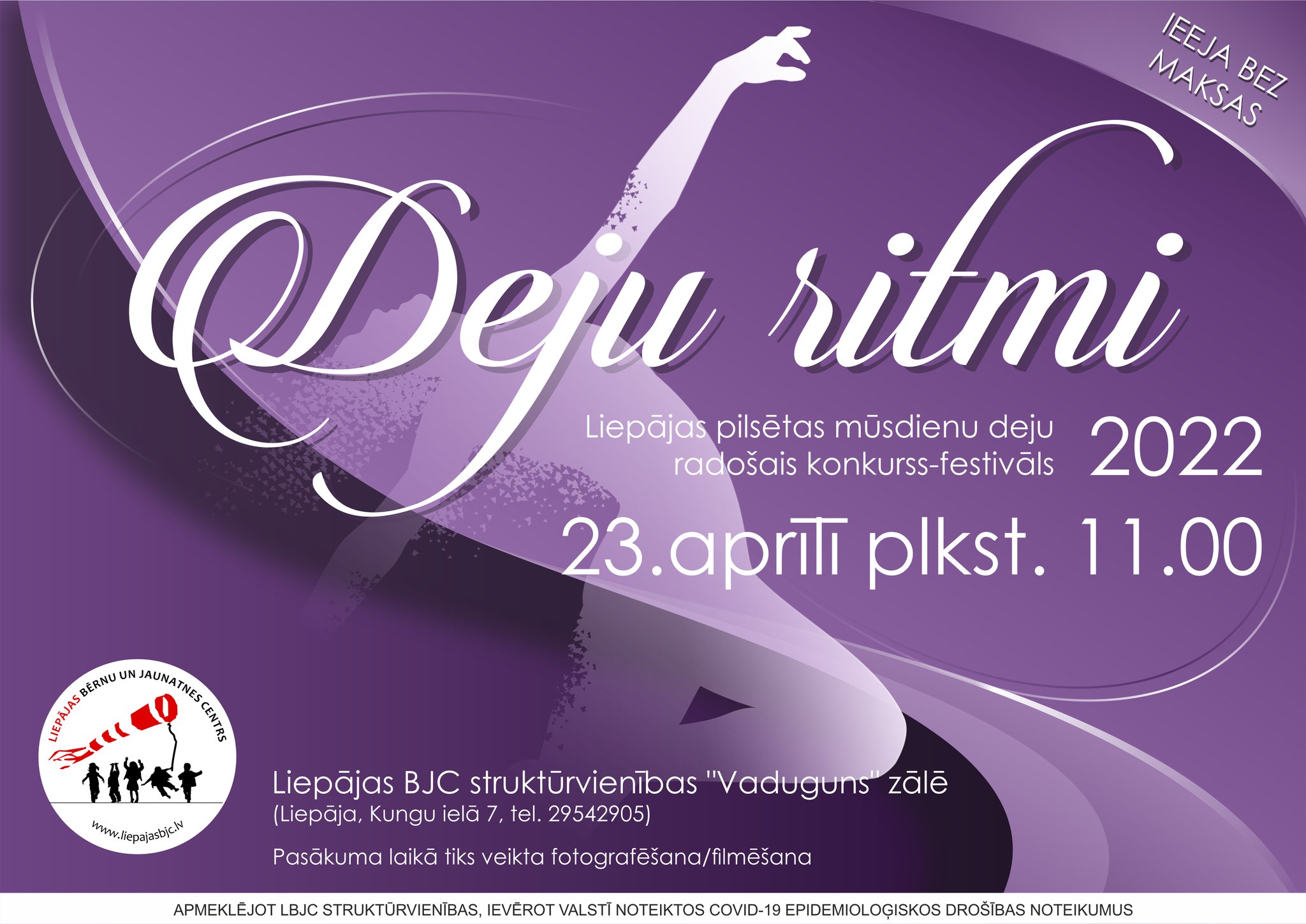 23. aprīlī pulksten 11 Liepājas BJC struktūrvienības "Vaduguns" zālē Liepājas pilsētas mūsdienu deju radošais konkurss-festivāls "Deju ritmi 2022".