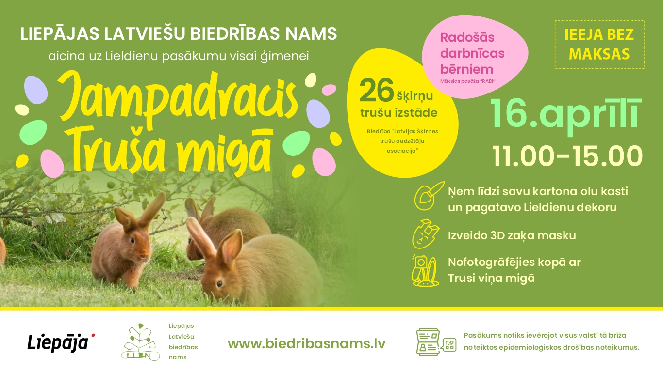 16.aprīlī no plkst. 11.00 līdz 15.00 Liepājas Latviešu biedrības namā norisināsies Lieldienu pasākums visai ģimenei “Jampadracis Truša migā”. Pasākuma laikā Lielajā zālē ikviens interesents varēs aplūkot 26 šķirņu trušu izstādi,… Sestdien, 16. aprīlī, pulksten 16 Aizputes Mūzikas skolas koncertzālē Pētera Vaska mūzikas festivāla “Meditācija” laikā notiks "Vestarda Šimkus solokoncerts". Koncerta programma: PĒTERIS VASKS (1946) Cikls "Gadalaiki" klavierēm: - "Baltā ainava"… Sestdien, 16. aprīlī, pulksten 17 Aizputē, sporta kompleksā Saules ielā, būs Lieldienu kausa izcīņa zolītē. |