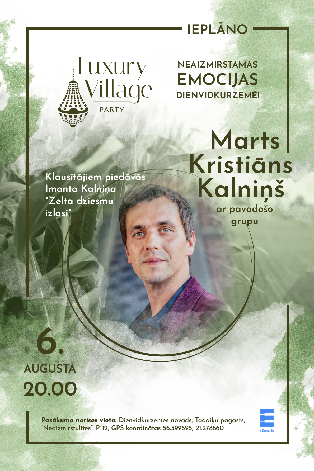 6. augustā pulksten 20 Dienvidkurzemes novada Tadaiķu pagasta saimniecībā "Neaizmirstulītes" notiks otrais "Luxury Village party" koncerts kukurūzas laukā. Tajā uzstāsies Marts Kristiāns Kalniņš. |